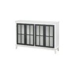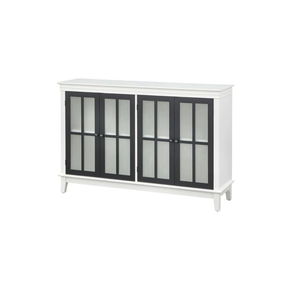 A white 4 door solid wood cabinet featuring black-framed frosted glass panes and tapered legs - Modera Furnish.