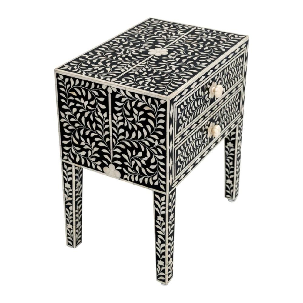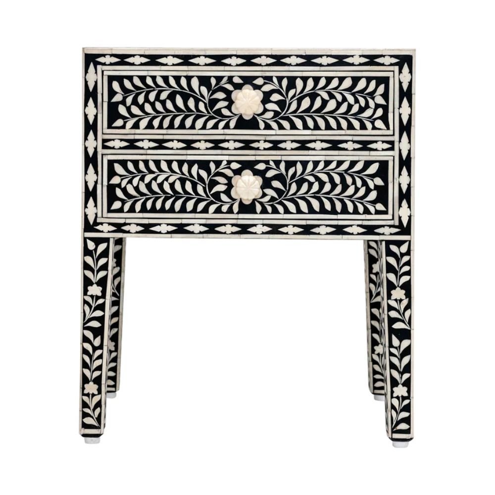 Ajmeri Bone Inlay Floral 2-Drawers Black Bedside Table