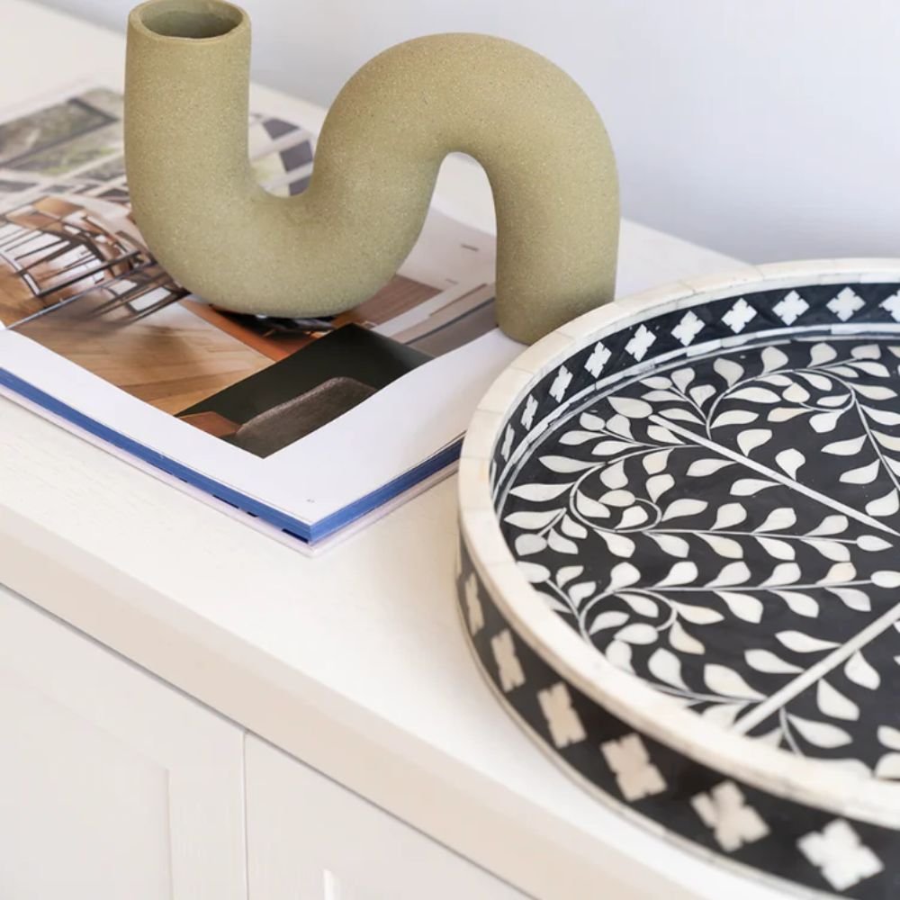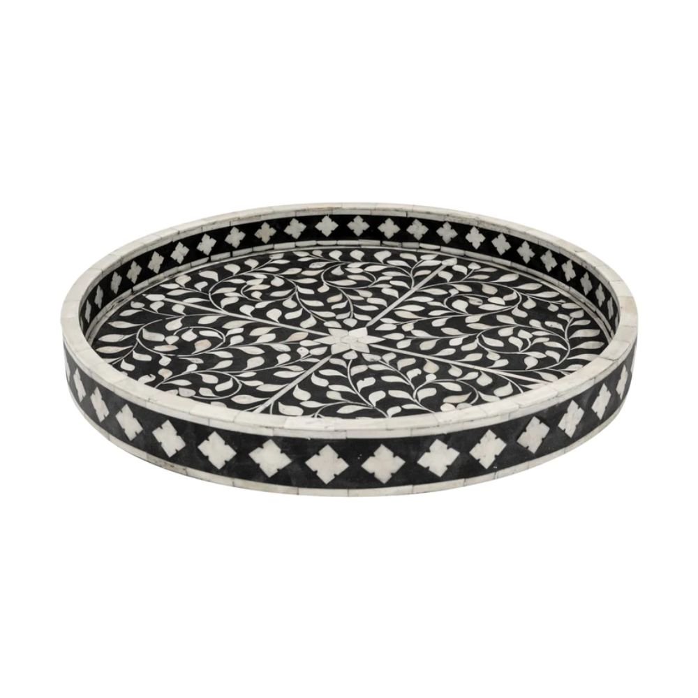 Elevate your entertaining and interior styling with our meticulously crafted Bone Inlay Tray – where artistry meets functionality in perfect harmony. Choose a piece that not only serves its purpose but also adds a touch of timeless elegance to your living space. Choose quality, craftsmanship, and style with our sophisticated bone inlay tray.