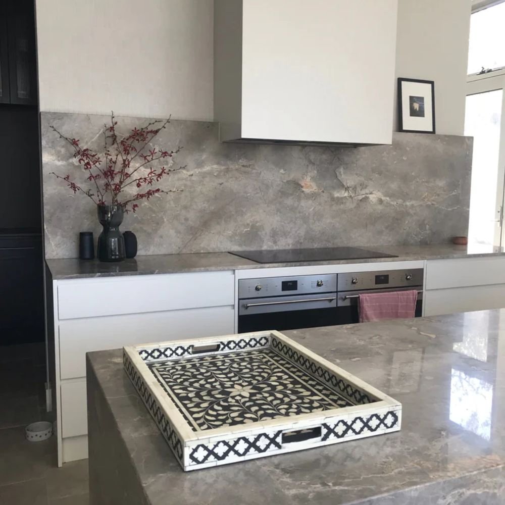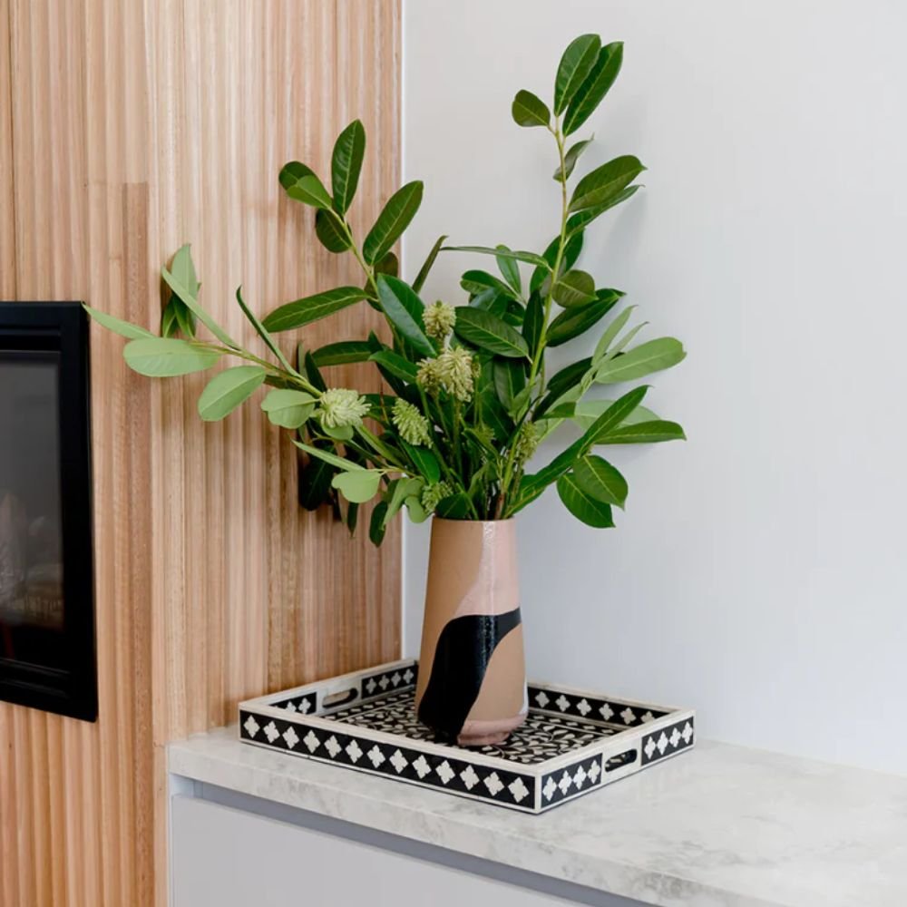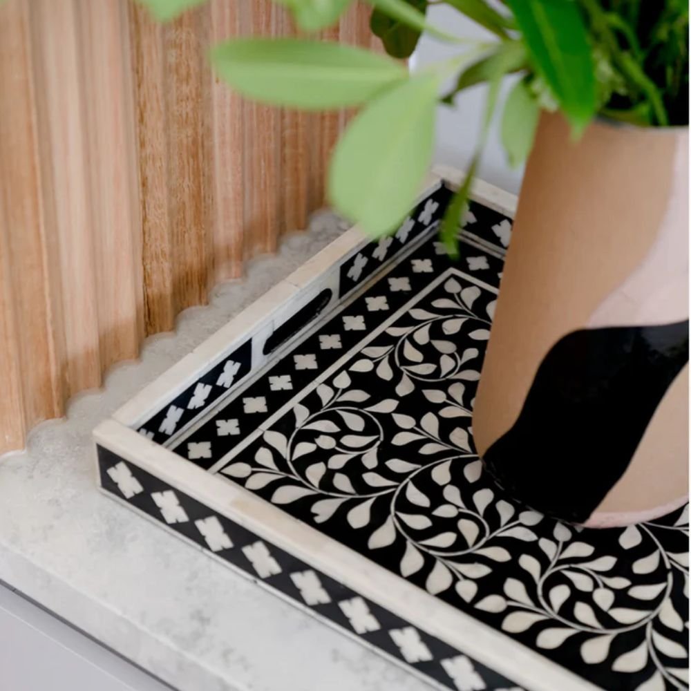 Elevate your entertaining and interior styling with our meticulously crafted Bone Inlay Tray – where artistry meets functionality in perfect harmony. Choose a piece that not only serves its purpose but also adds a touch of timeless elegance to your living space. Choose quality, craftsmanship, and style with our sophisticated bone inlay tray.