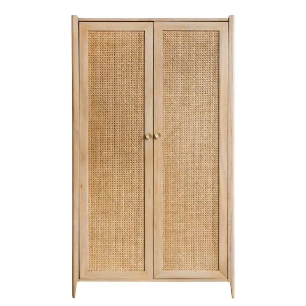 The height of 195 cm is ideal for creating a vertical focal point that draws the eye upward and balances the room’s proportions. By introducing the warm natural tones of this wardrobe, you add a layer of sophistication that feels both grounded and airy. Whether styled with minimalist bedroom accents or vibrant textiles, the impact of the wood texture creates an inviting atmosphere that reflects a high standard of living. The airy cane panels allow for a soft visual transition, making the piece a versatile asset as your personal style evolves.
