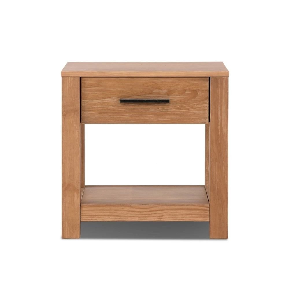 Style the bedside table with a ceramic or metal lamp, stacked books, and a small plant to highlight its natural finish. Pair it with neutral linens and earthy textures for a cohesive look. For a coordinated bedroom setup, explore Modera Furnish Bedroom collections to find complementary beds and storage pieces. Matte accessories and warm lighting enhance its rustic appeal. For global bedroom styling inspiration, browse Architectural Digest.