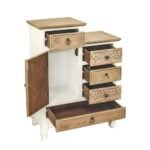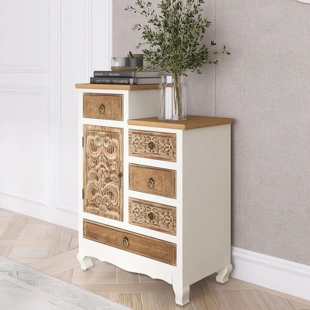 This classic cabinet blends vintage character with beautifully carved detailing, bringing warmth, texture, and artistry into any room. Crafted from solid wood and finished in a soft distressed white and natural tone, it offers a charming presence that instantly elevates interior décor. Its compact dimensions make it ideal for small and medium-sized spaces, offering meaningful storage without overwhelming the layout.