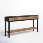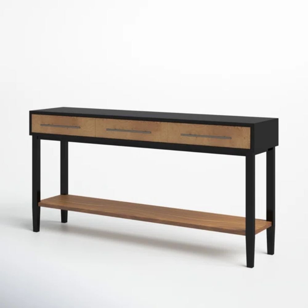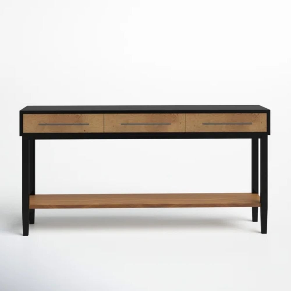 The drawer fronts display natural grain variation, introducing warmth and character across the length of the piece. Clean edges and flush alignment reinforce a composed, linear appearance. The lower shelf adds dimensional layering, creating shadow depth that enhances visual interest without ornamentation. These details allow the console table to feel tactile, balanced, and intentionally restrained. Beyond its immediate function, this console table contributes to a sense of spatial organization that supports everyday routines. Its elongated surface naturally encourages thoughtful placement of objects, allowing essentials to remain accessible while maintaining a composed visual order.