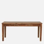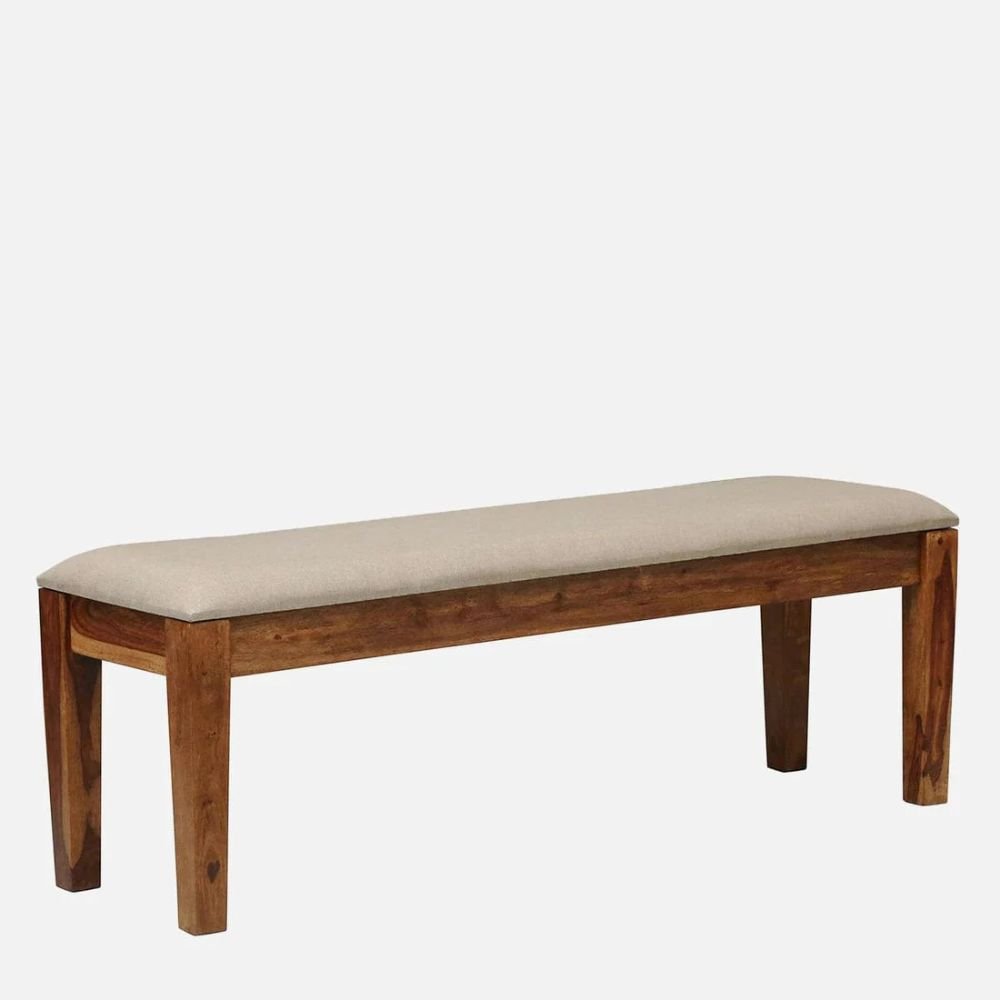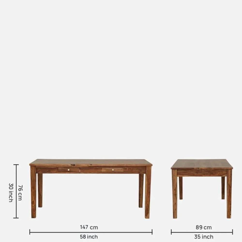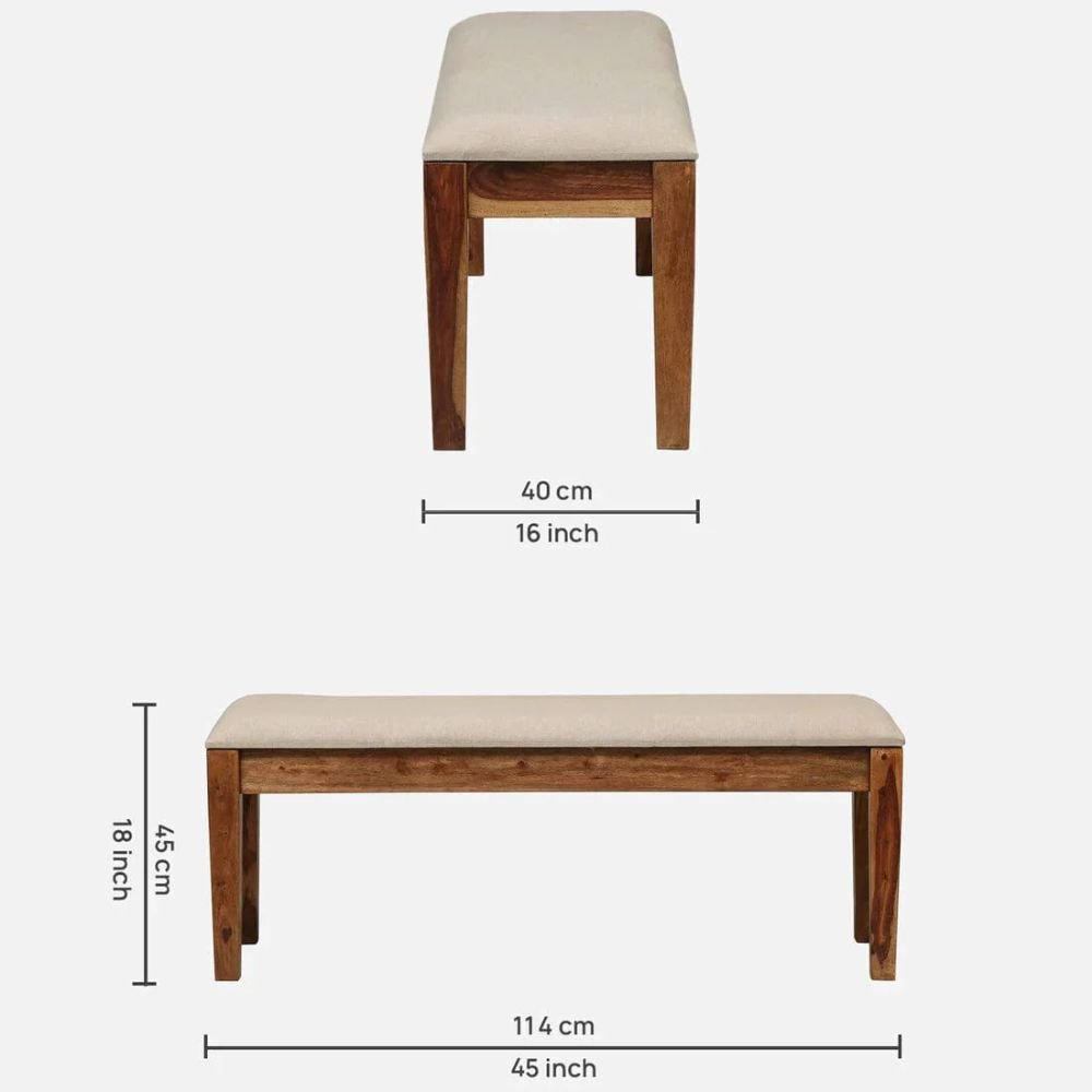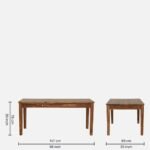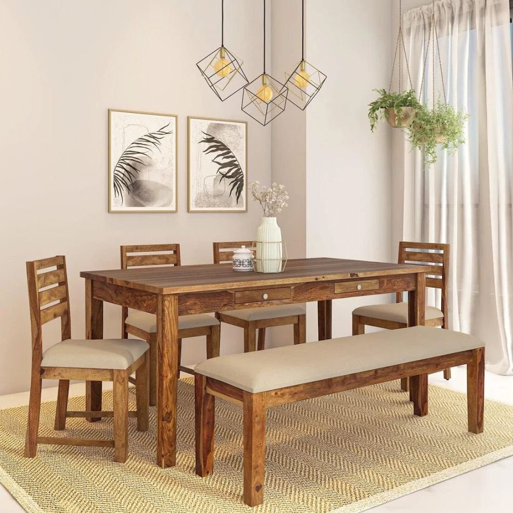The structural integrity of this piece is rooted in the use of premium sheesham wood, ensuring a lifetime of reliability. The 58-inch table surface of this dining set is complemented by four chairs and a spacious 45-inch cushioned bench for maximum comfort and efficient organization.