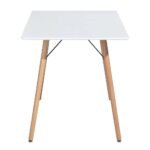 Clean edges and straight lines reinforce the table’s contemporary silhouette, while the angled legs add dimension and movement beneath the tabletop. The contrast between the bright white surface and the warm undertones of solid wood creates a layered, three-dimensional effect that feels modern yet inviting. Every design detail is intentional, allowing material quality and proportion to define the table’s visual identity rather than decorative elements.