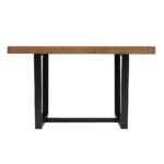 Beneath the tabletop, the table is supported by a strong metal base that adds industrial strength and visual contrast. The metal structure distributes weight evenly while keeping the under-table area open and functional. This design allows chairs to slide in comfortably and ensures ease of movement around the table. The combination of solid wood and metal creates a dependable foundation that supports both daily use and long-term reliability.