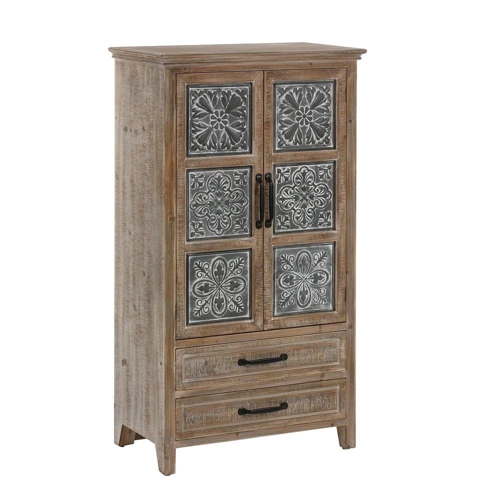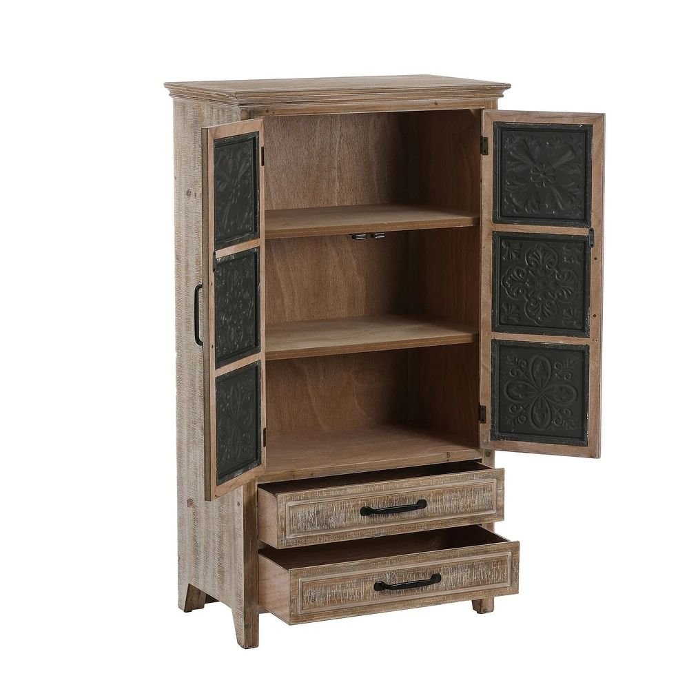 Defined by farmhouse design principles, this 2-door wardrobe blends solid wood construction with decorative metal panel detailing to create a piece that feels authentic and lived-in. The weathered finish softens the overall look, highlighting natural grain variation while giving the surface an aged, comfortable character. With a combination of enclosed shelving and drawer storage, the wardrobe adapts easily to bedrooms, living rooms, and study spaces where organization and character must coexist.