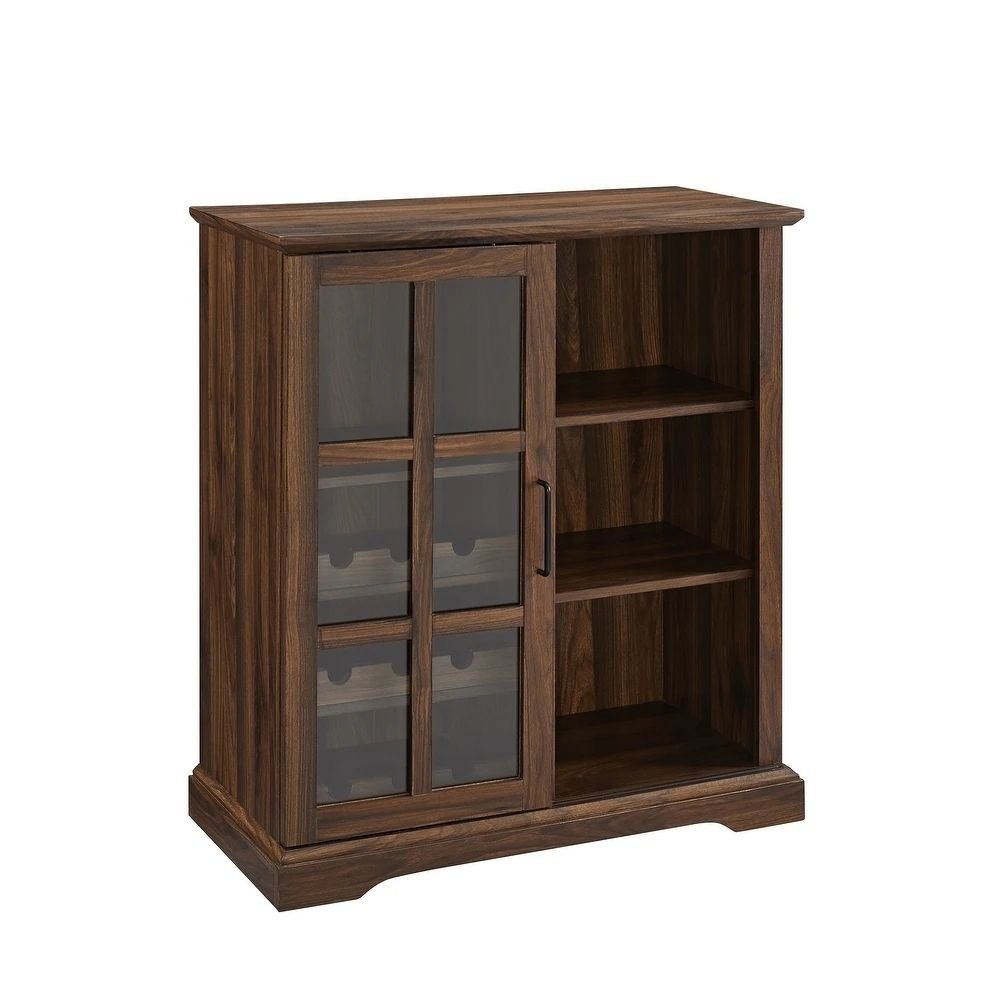 Crafted from premium solid wood and finished in deep walnut, this glass door bar cabinet exudes refined artistry. Its smooth sliding glass door glides effortlessly, revealing a beautifully organized interior that showcases your favorite spirits and glassware. The combination of wood and glass introduces texture, depth, and light into your décor — ideal for both traditional and transitional interiors.