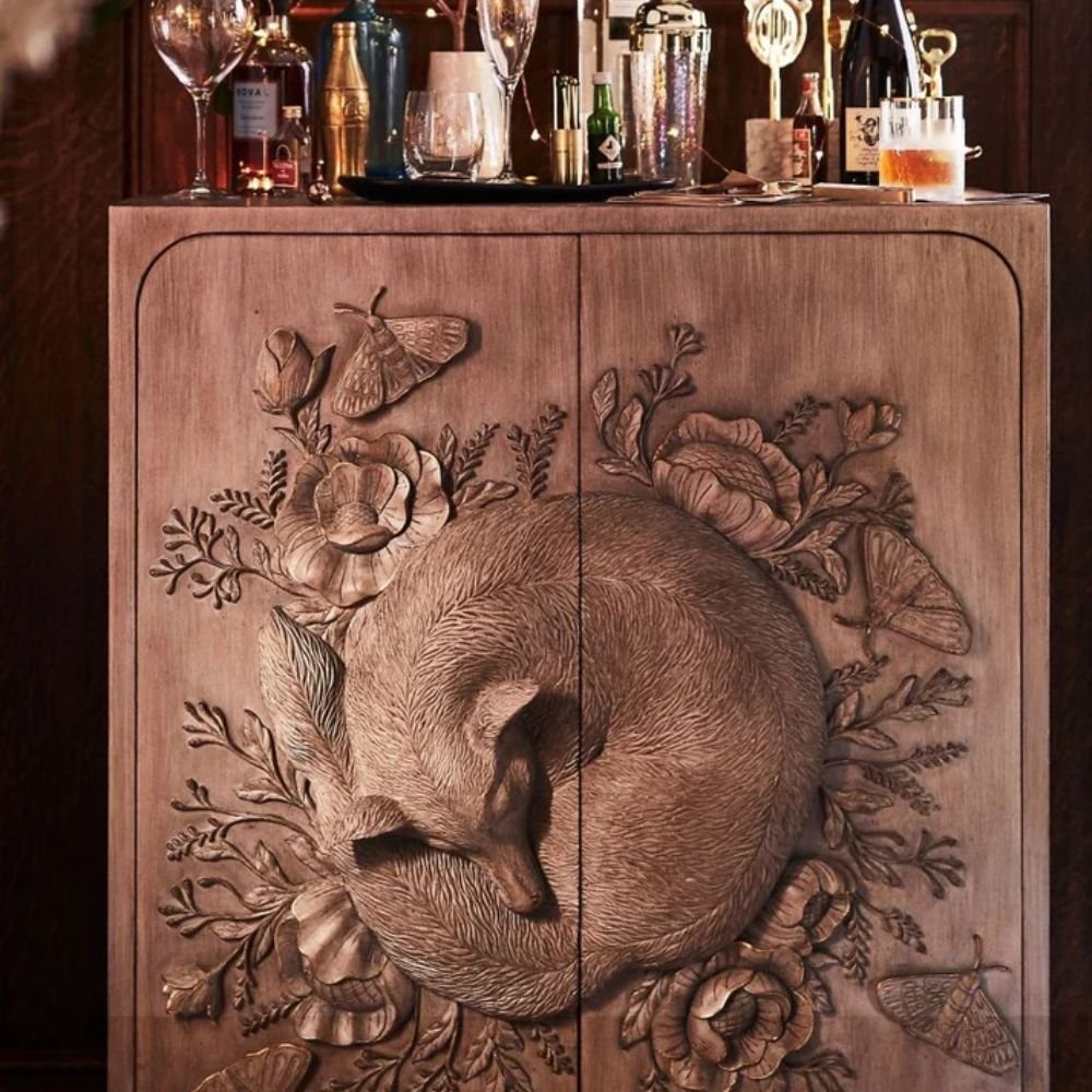 Hand Carved Land & Sky Bar Cabinet with Fox Design