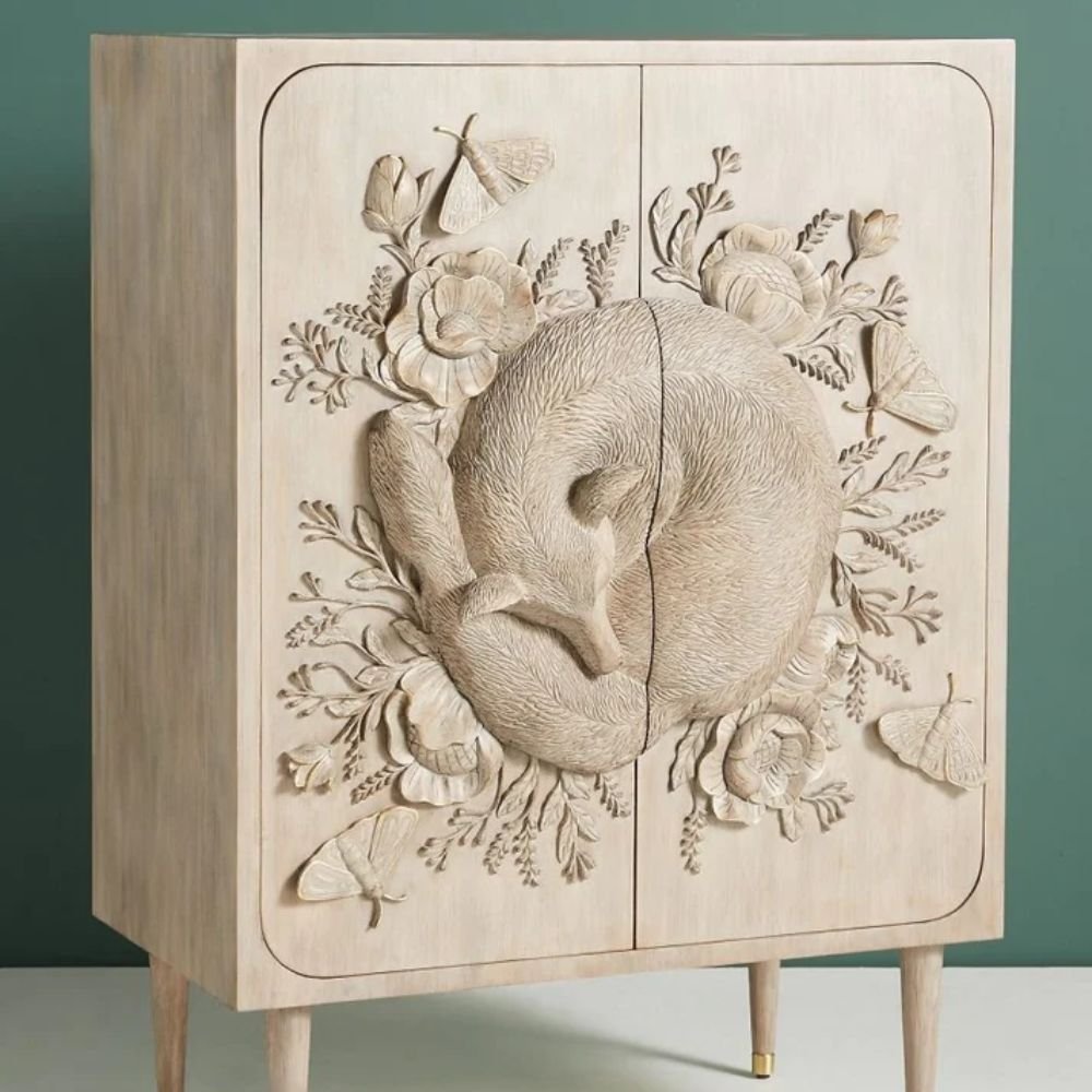 Home Collections Hand Carved Land & Sky Bar Cabinet with Fox Design