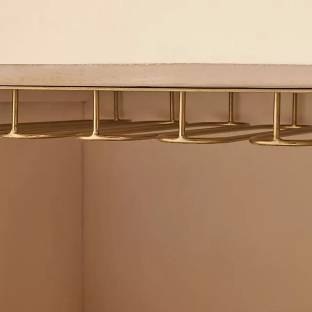 Stemware Storage: Equipped with internal metal racks to safely hang wine glasses and maximize available shelf space.