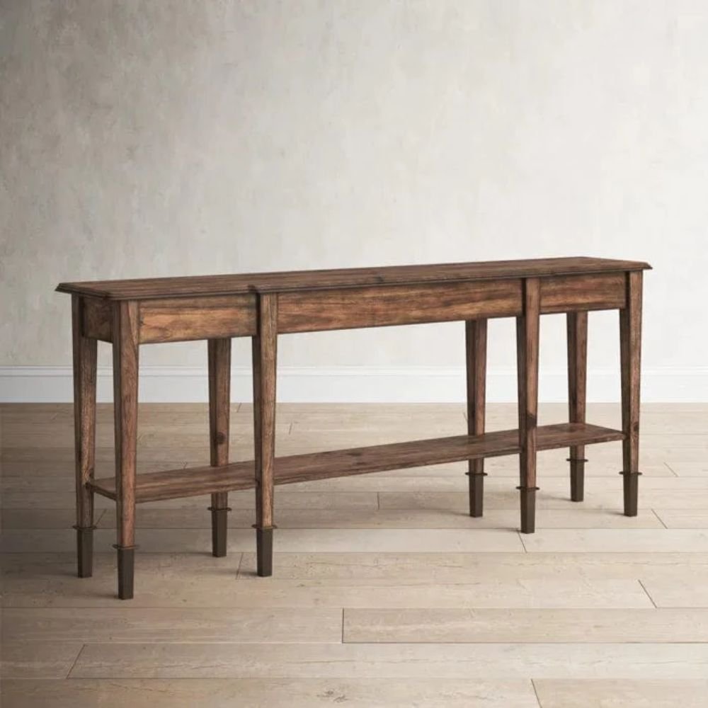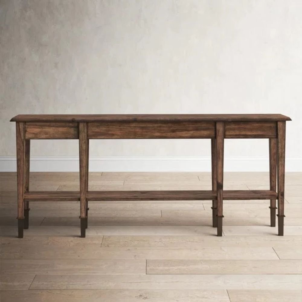 The height of 32 inches is ideal for creating a layered vignette with multiple table lamps and large-scale framed artwork. By introducing the rich umber tones of this console table, you add a layer of sophistication that feels both grounded and airy. Whether styled with minimalist ceramics or lush greenery, the impact of the wood texture reflects a high standard of living and a keen eye for contemporary design. The 10-inch floor clearance provides a light, floating aesthetic despite the piece’s grand size.