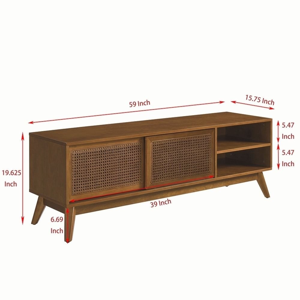 The cabinet fronts feature woven cane panels framed in solid walnut, introducing natural texture and breathable visual depth. The cane detailing softens the overall structure while reinforcing classic mid-century design cues.