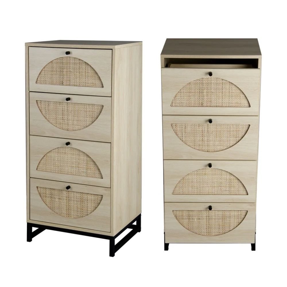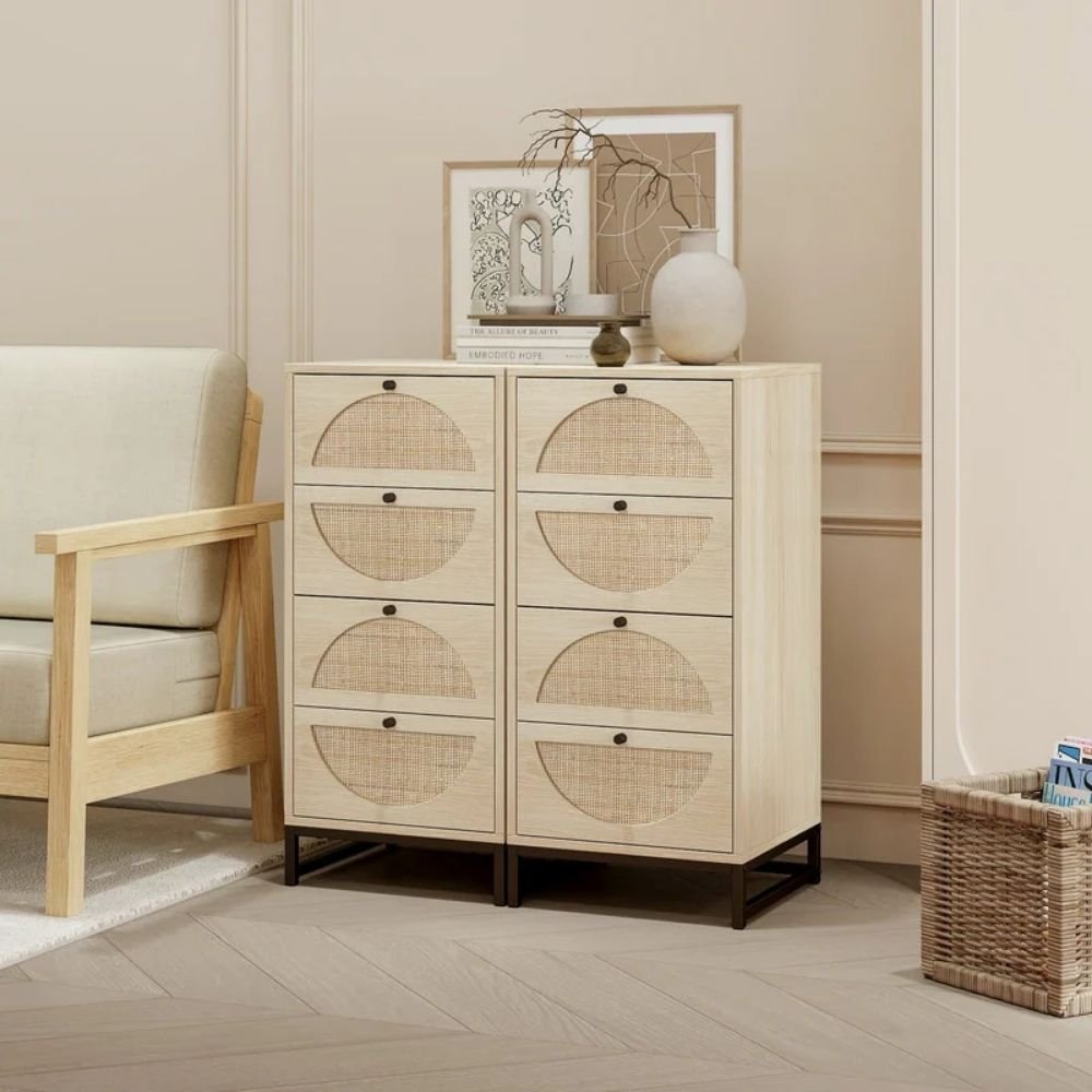 Crafted from high-quality solid wood and finished in a natural tone, these chests highlight organic grain patterns and a refined simplicity suited for modern, Scandinavian, bohemian, and contemporary interiors. The cane drawer fronts feature a distinctive half-circle motif, creating a geometric design that feels artistic and balanced. The warm tonal palette ensures visual softness, while the metal base adds a subtle architectural contrast.