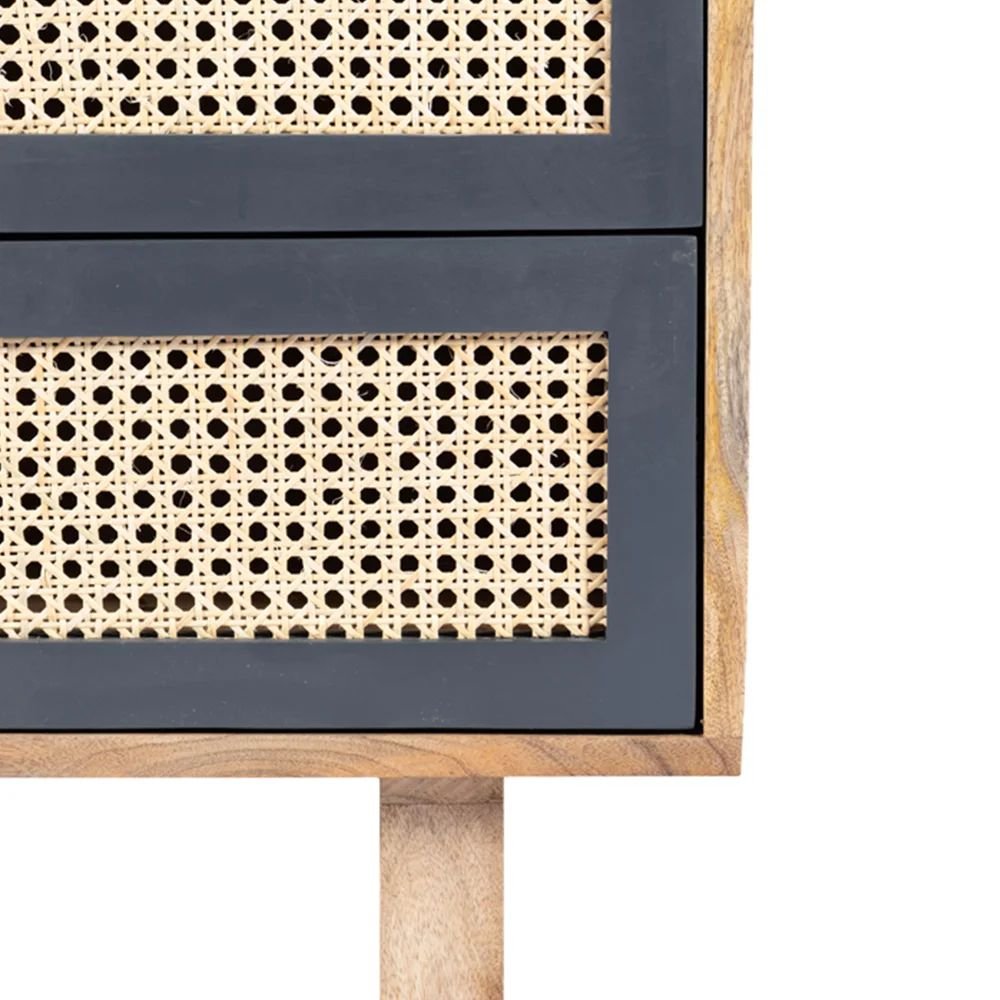 A natural vertical solid wood chest of drawers featuring five drawers with hand-woven cane panels and an X-frame base - Modera Furnish.