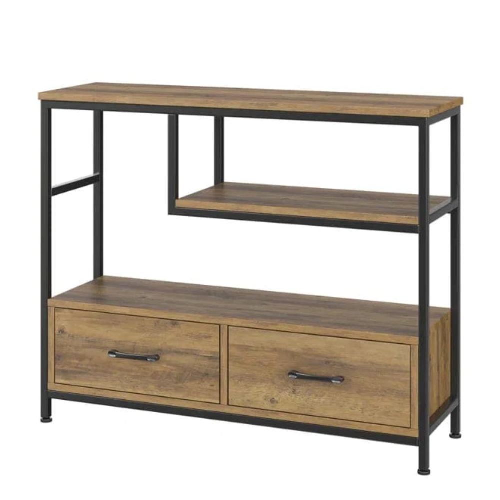An industrial 39.3-inch console table with two drawers and staggered open shelves featuring a black iron frame and oak-finished wood - Modera Furnish.