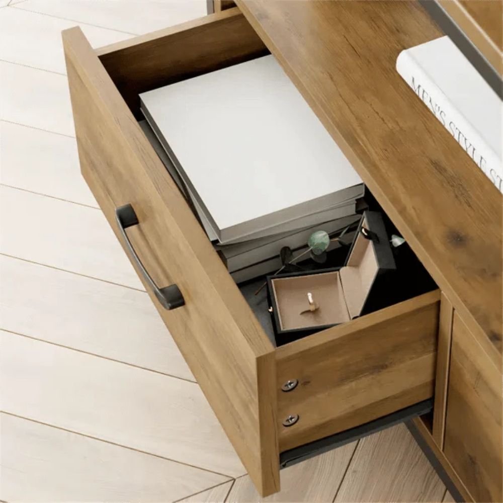 The finish depth is achieved through a multi-step veneering process that highlights the realistic texture of the wood fibers. This creates a tactile experience where the material expression feels warm and organic to the touch despite its sturdy, industrial build. Light dances across the flat-panel drawer fronts and the matte black handles, revealing subtle variations in the grain that ensure your console table feels like a bespoke work of functional art. It is this dedication to structural detail—from the 11.8-inch depth to the 1.18-inch thick frame—that elevates the product from simple furniture to a definitive style statement. The signature Z-shaped staggered shelf design creates a continuous, flowing line that emphasizes the seamless luxury of the piece.