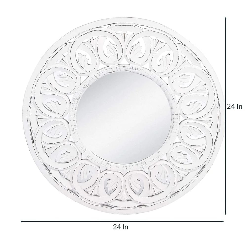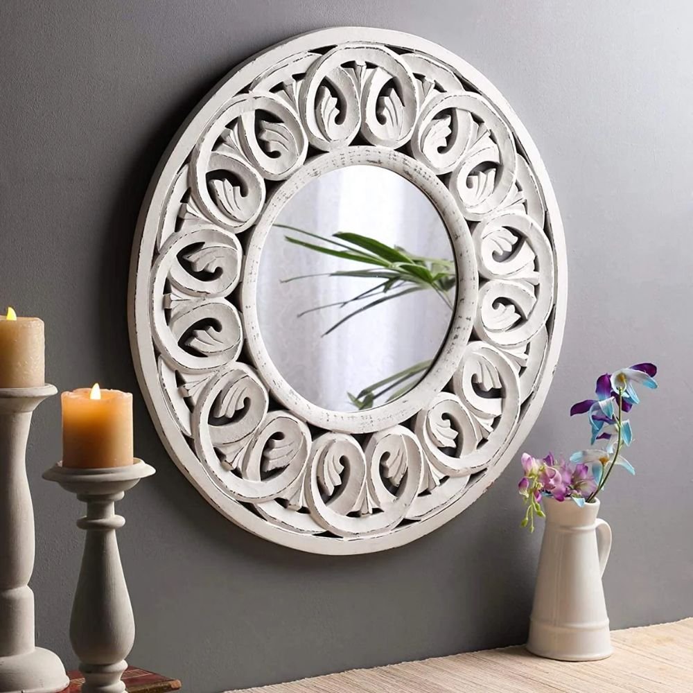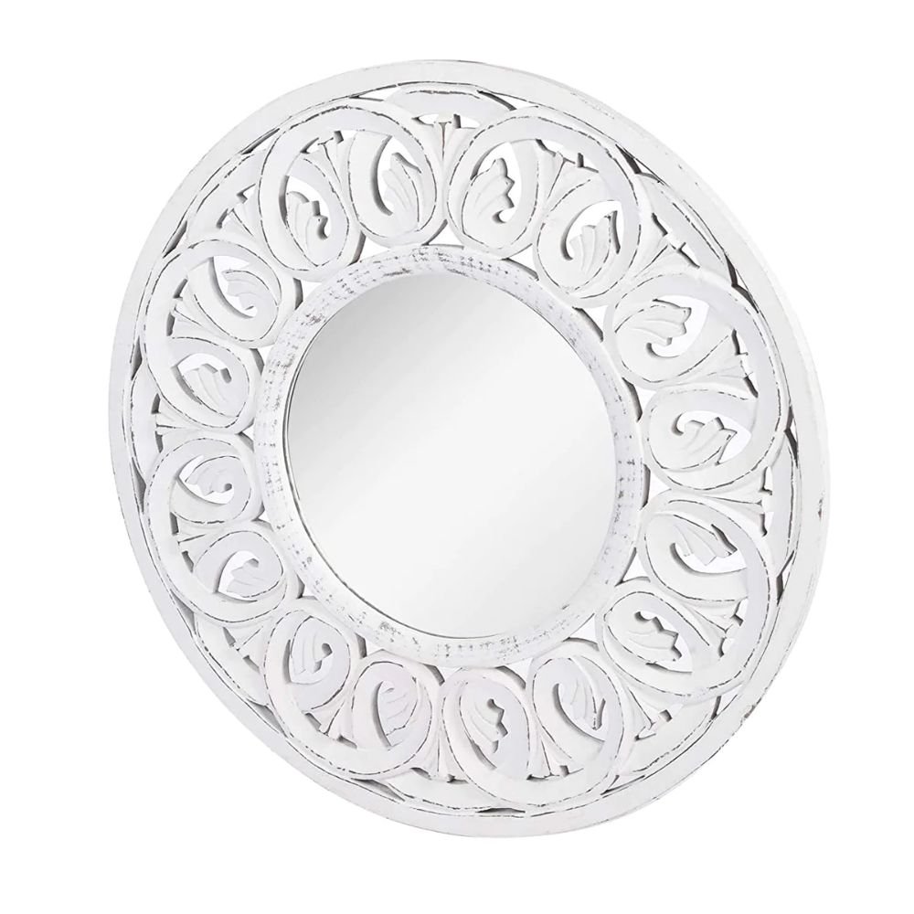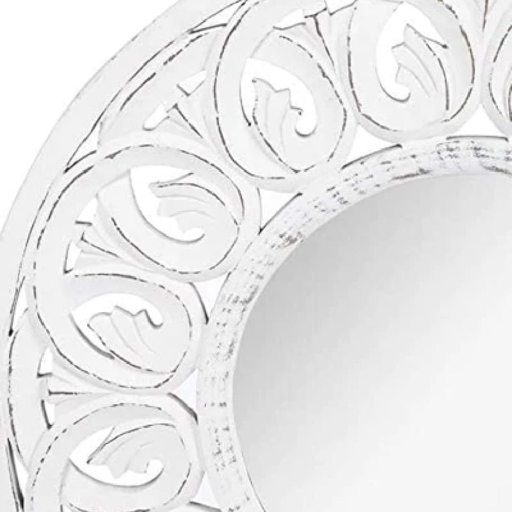 Handcrafted round white wood wall mirror with floral carvings and distressed finish - Modera Furnish