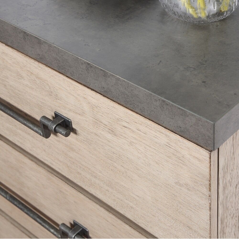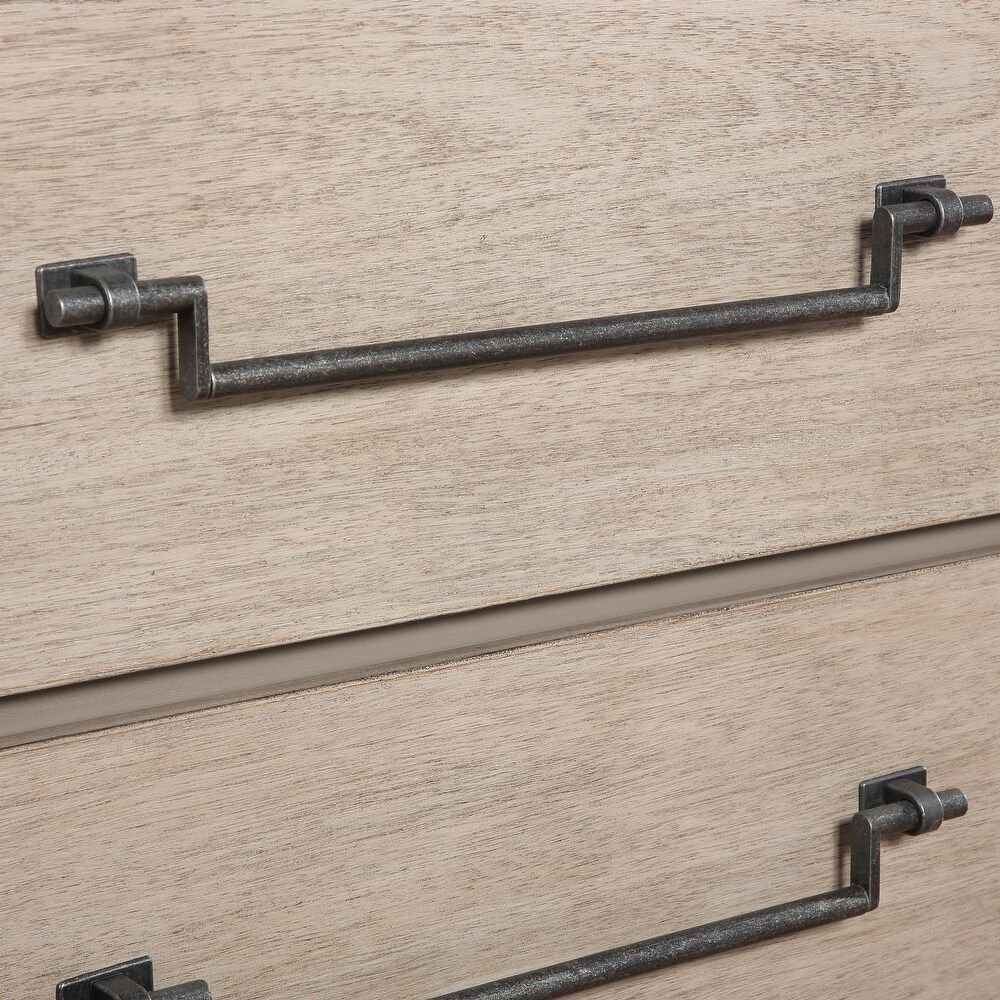 In a guest room, the chest provides convenient storage while enhancing the room’s décor with a natural wood presence. The sleek metal handles add a subtle contemporary edge that complements both soft and structured styling elements.