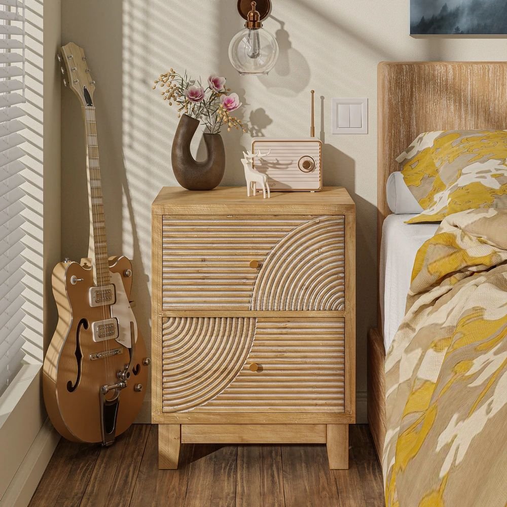The height of 24.25 inches is ideal for creating a layered vignette with stylish table lamps and curated greenery. By introducing the natural wood tones of this bedside table, you add a layer of sophistication that feels both grounded and modern. Whether styled with minimalist ceramics or textured bedding, the impact of the fluted texture reflects a high standard of living. The dual drawers allow for a clutter-free environment, making the piece a versatile asset as your personal style evolves over time.