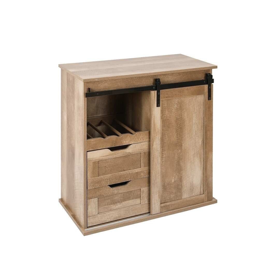 This wine and storage cabinet captures the essence of country charm through its soft, natural oak finish and solid wood texture. Its barn-style sliding door, accented with matte black metal hardware, brings a touch of industrial flair while maintaining an organic aesthetic.