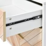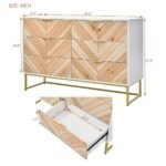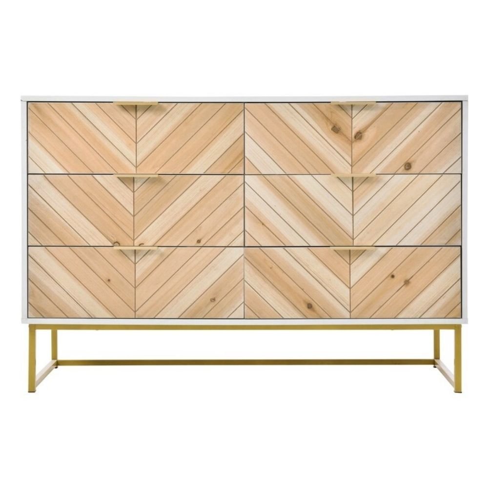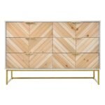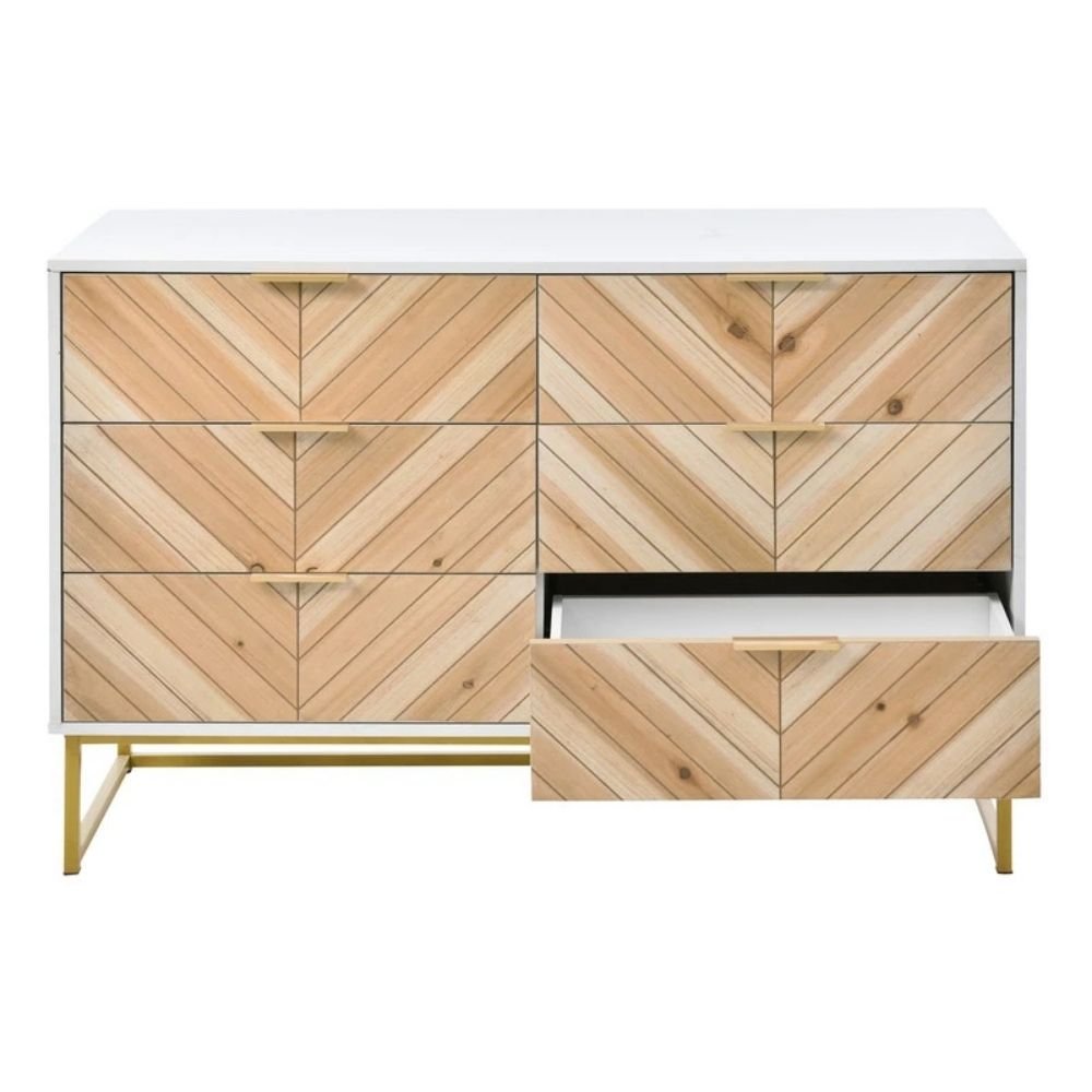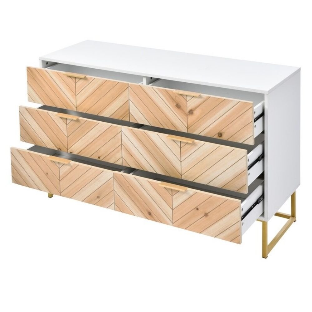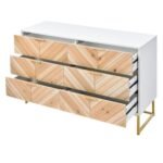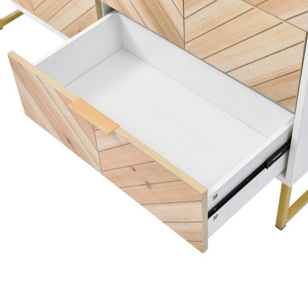 The standout feature is the chevron-inspired pattern across the drawer fronts. Rich natural tones and angled grain lines create a soft dimensional effect that gives the design artistic depth. The contrast between the warm wood and crisp white body highlights each drawer front, adding subtle movement and visual interest. The smooth edges and precise pattern alignment reflect skilled craftsmanship. Gold-toned metal legs, slim and modern in form, complement the natural textures while enhancing the piece’s mid-century aesthetic. These stylistic touches allow the chest to integrate into minimal, transitional, or Scandinavian-inspired environments.
