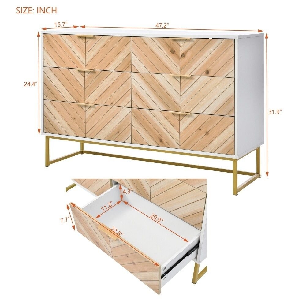 This thoughtfully crafted unit includes six smooth-gliding drawers that provide versatile storage for clothing, accessories, linens, or household items. Its generous width offers plenty of space to accommodate daily use without feeling bulky. The top surface provides room for décor, lighting, or framed photographs, allowing the piece to function both as a storage solution and as a display area. Supported by a sturdy metal frame, it maintains stability while appearing visually light. The solid wood construction ensures long-term durability, and the balanced measurements make it suitable for a variety of interior layouts without overwhelming the room.