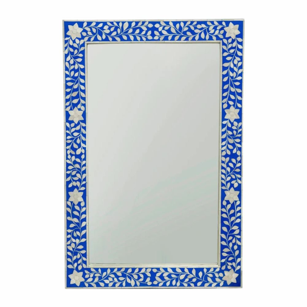 Rajasthani Bone Inlay Floral Rectangle Blue Mirror