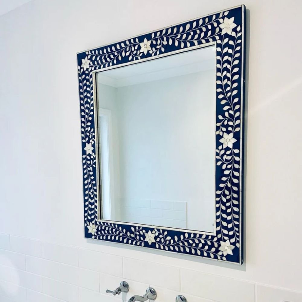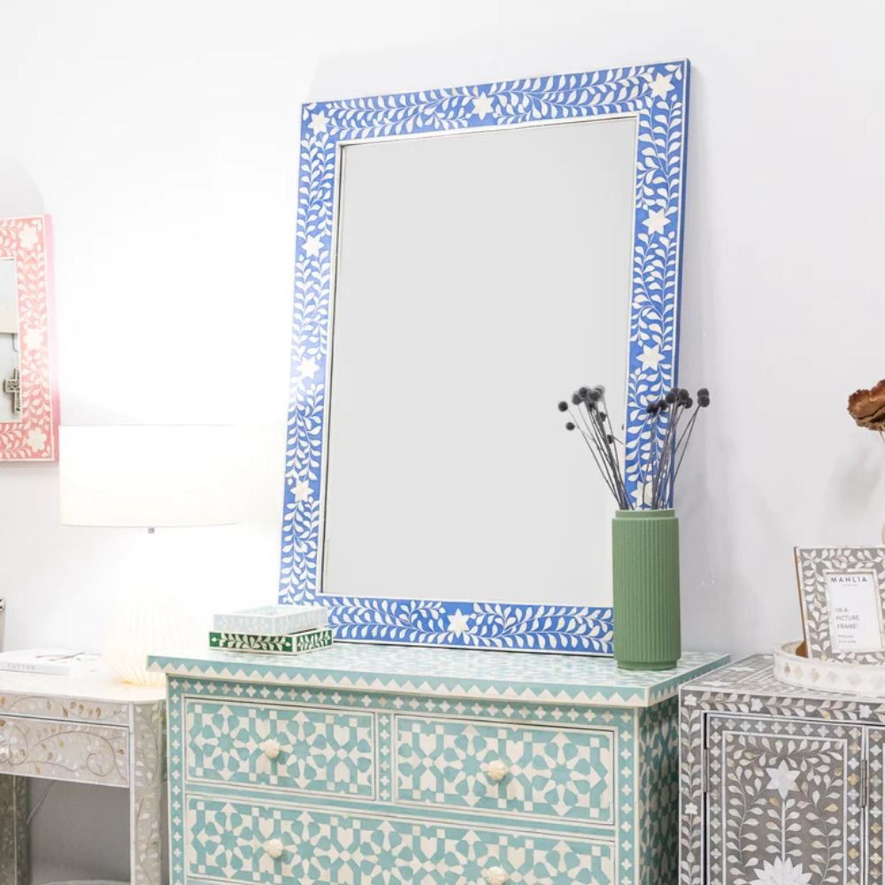 Home Collections Rajasthani Bone Inlay Floral Rectangle Blue Mirror
