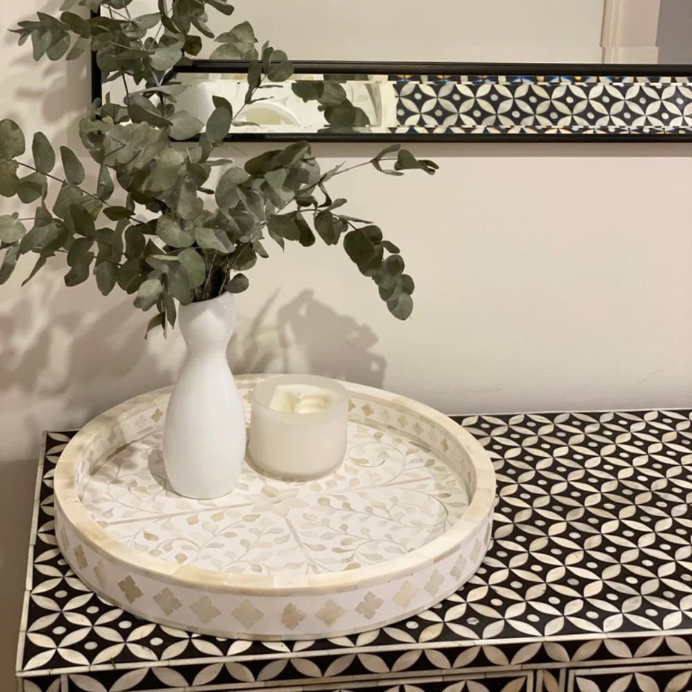 Elevate your entertaining and interior styling with our meticulously crafted Bone Inlay Tray – where artistry meets functionality in perfect harmony. Choose a piece that not only serves its purpose but also adds a touch of timeless elegance to your living space. Choose quality, craftsmanship, and style with our sophisticated bone inlay tray.
