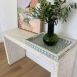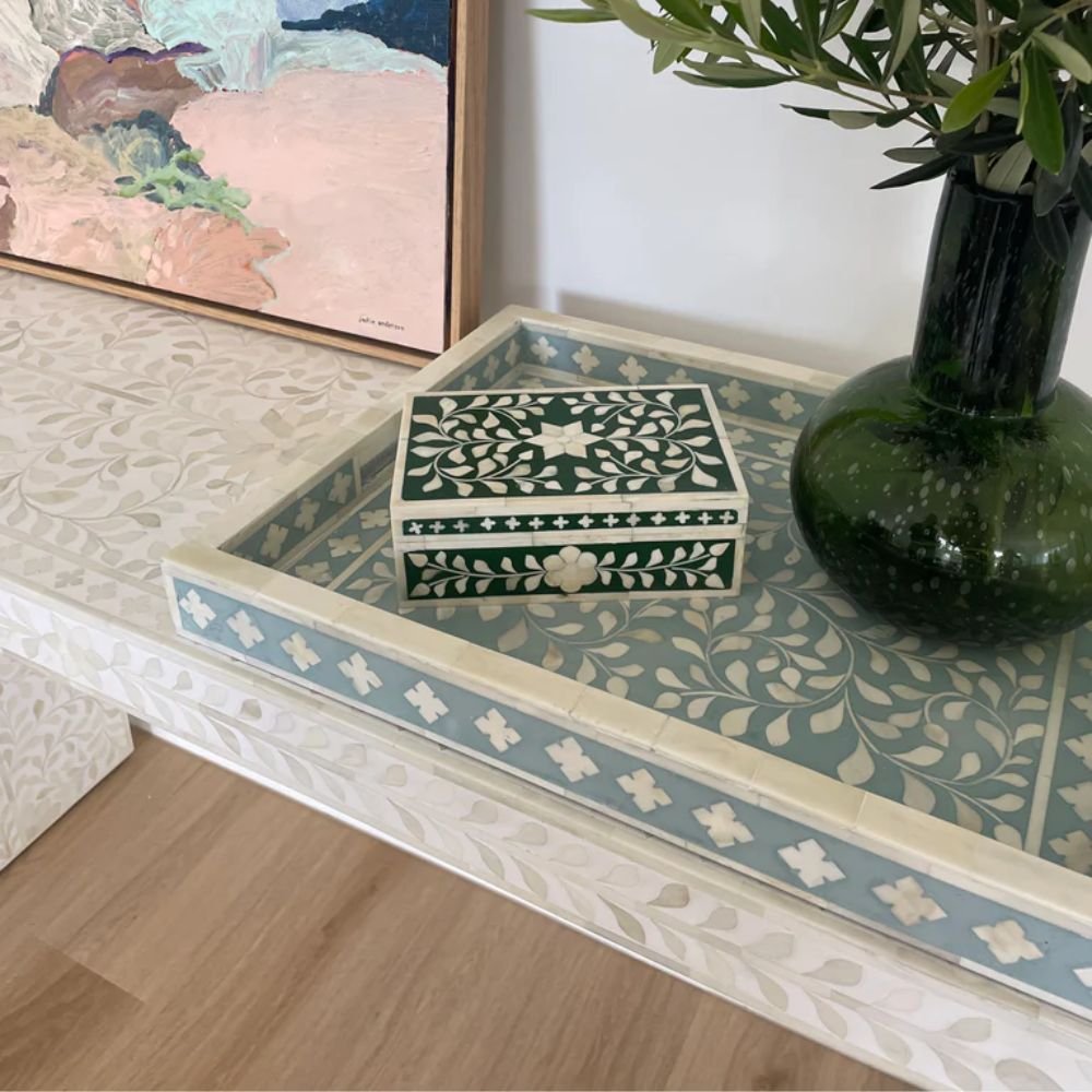 Elevate your entertaining and interior styling with our meticulously crafted Bone Inlay Tray – where artistry meets functionality in perfect harmony. Choose a piece that not only serves its purpose but also adds a touch of timeless elegance to your living space. Choose quality, craftsmanship, and style with our sophisticated bone inlay tray.