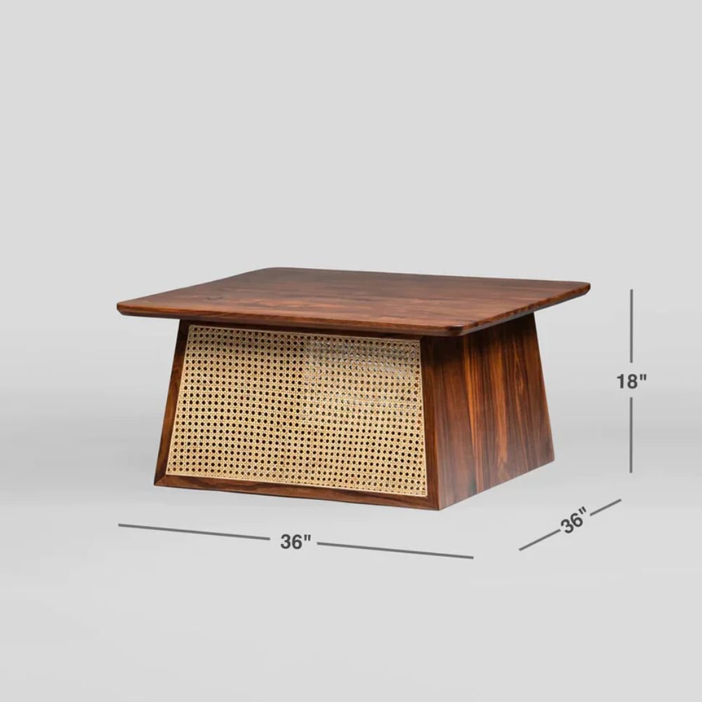 A walnut-finish solid Sheesham wood square coffee table featuring hand-woven rattan side panels and a 36-inch width - Modera Furnish.
