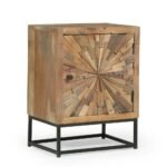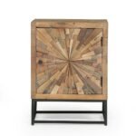 A sophisticated natural finish solid reclaimed wood accent cabinet featuring a hand-pieced 3D sunburst door and industrial metal sled base - Modera Furnish.