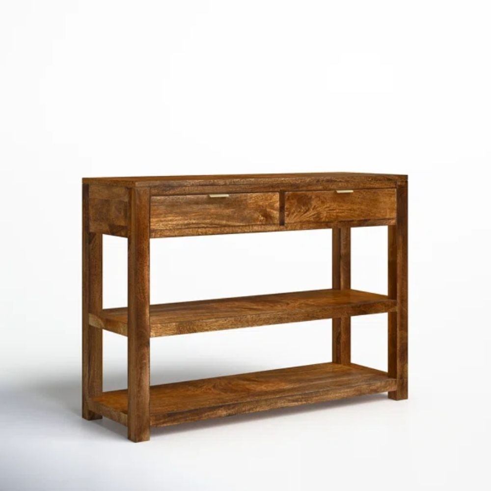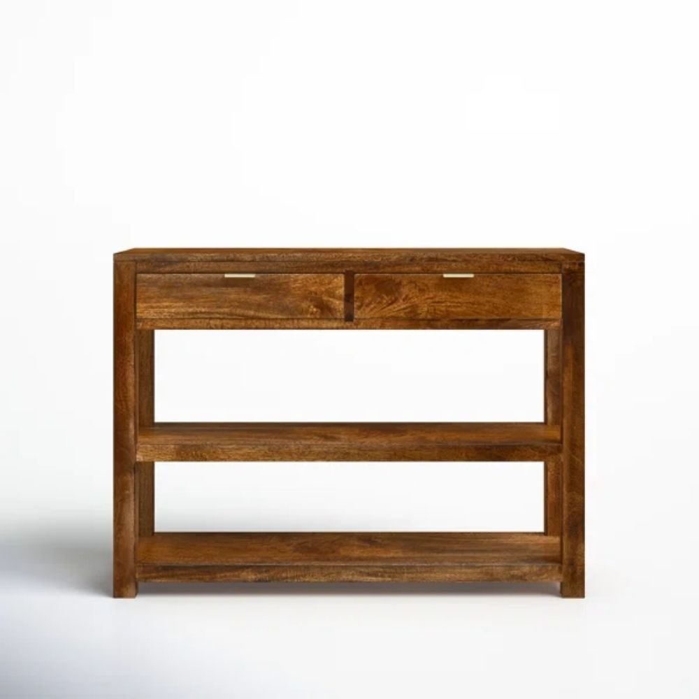 A brown rectangular solid wood console table with two drawers and two open storage shelves - Modera Furnish