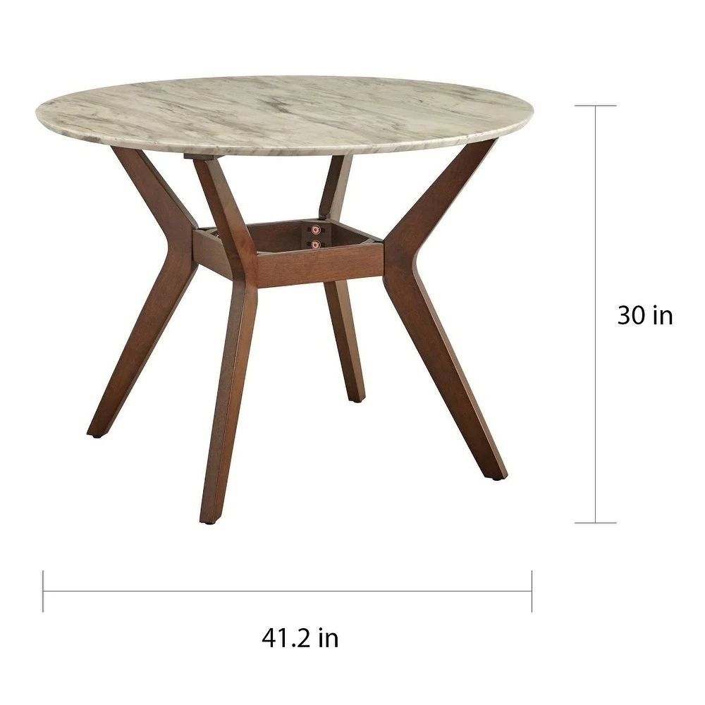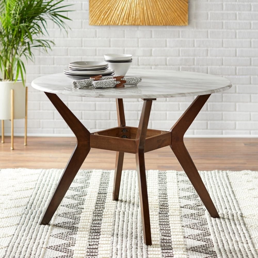 Its circular form breaks up rigid lines often found in modern interiors, making the dining area feel more welcoming and cohesive. The contrast between the light tabletop and walnut base adds depth without overpowering the room. Ideal for compact dining rooms or multifunctional spaces, the table anchors the area while maintaining visual openness. Its sculptural base draws subtle attention, allowing the table to function as both a practical dining surface and a design statement that elevates the overall atmosphere of the space.