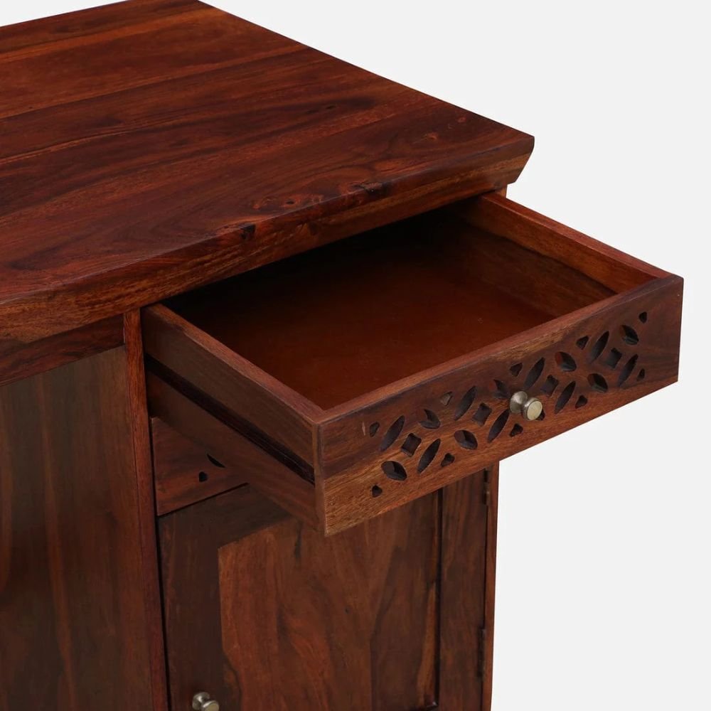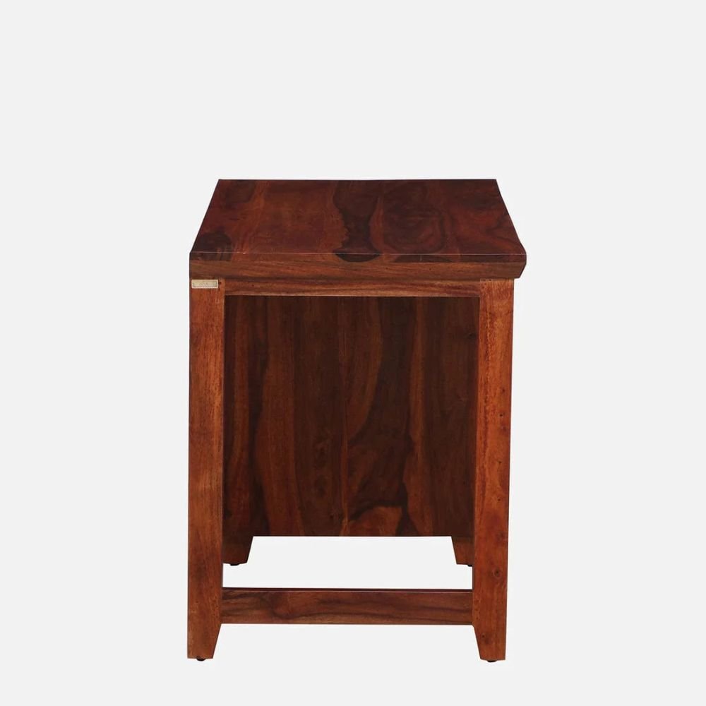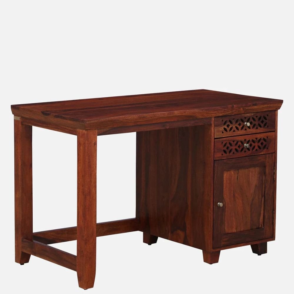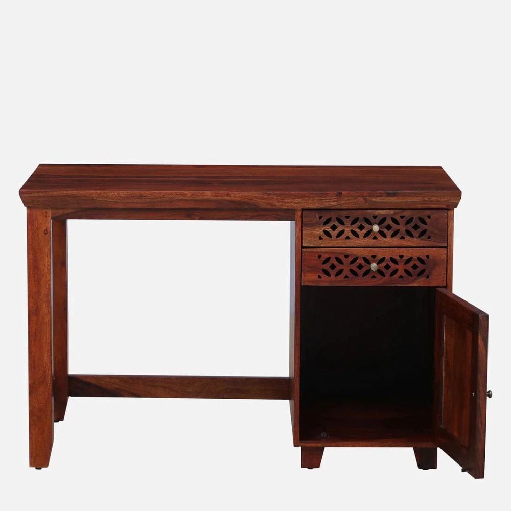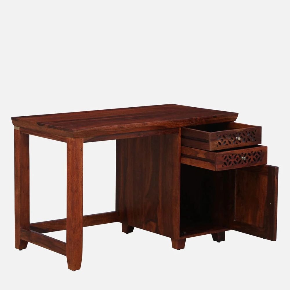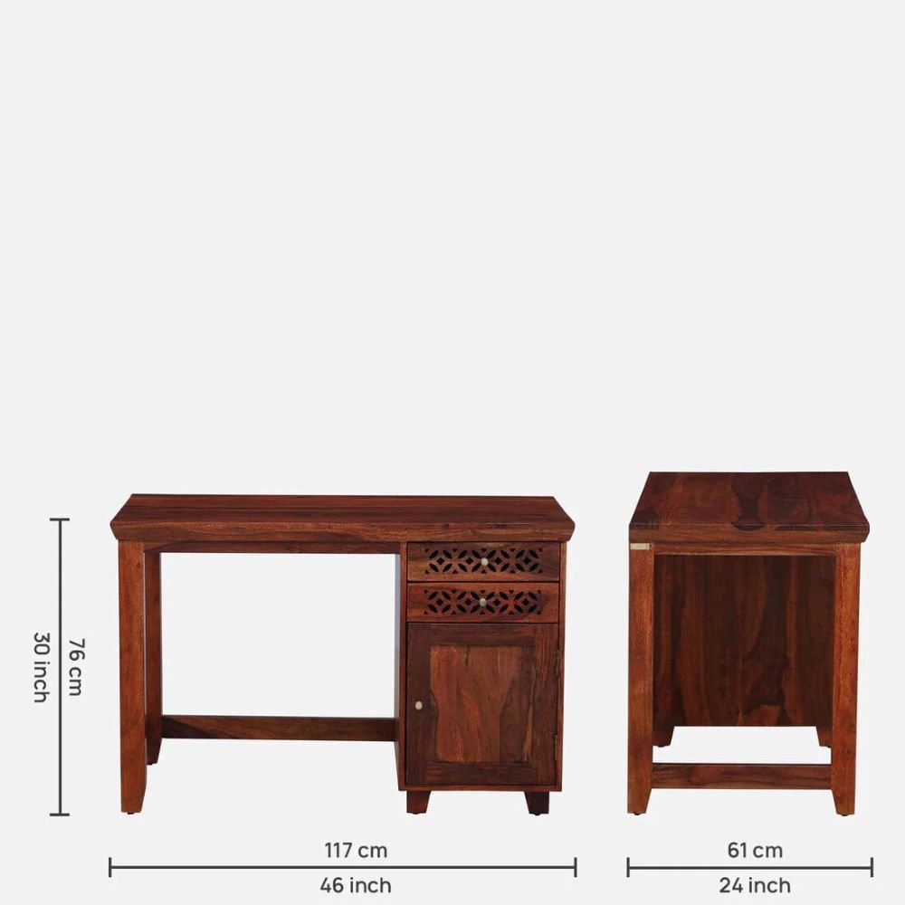 The structural provenance of this piece is rooted in the utilization of premium solid sheesham wood, guaranteeing a lifetime of unwavering reliability. Its calibrated plateau is augmented by a multi-tiered storage configuration, featuring two integrated drawers and a spacious side cabinet for peak organizational precision.