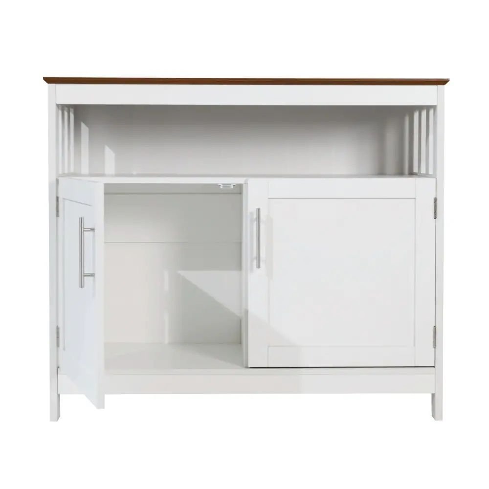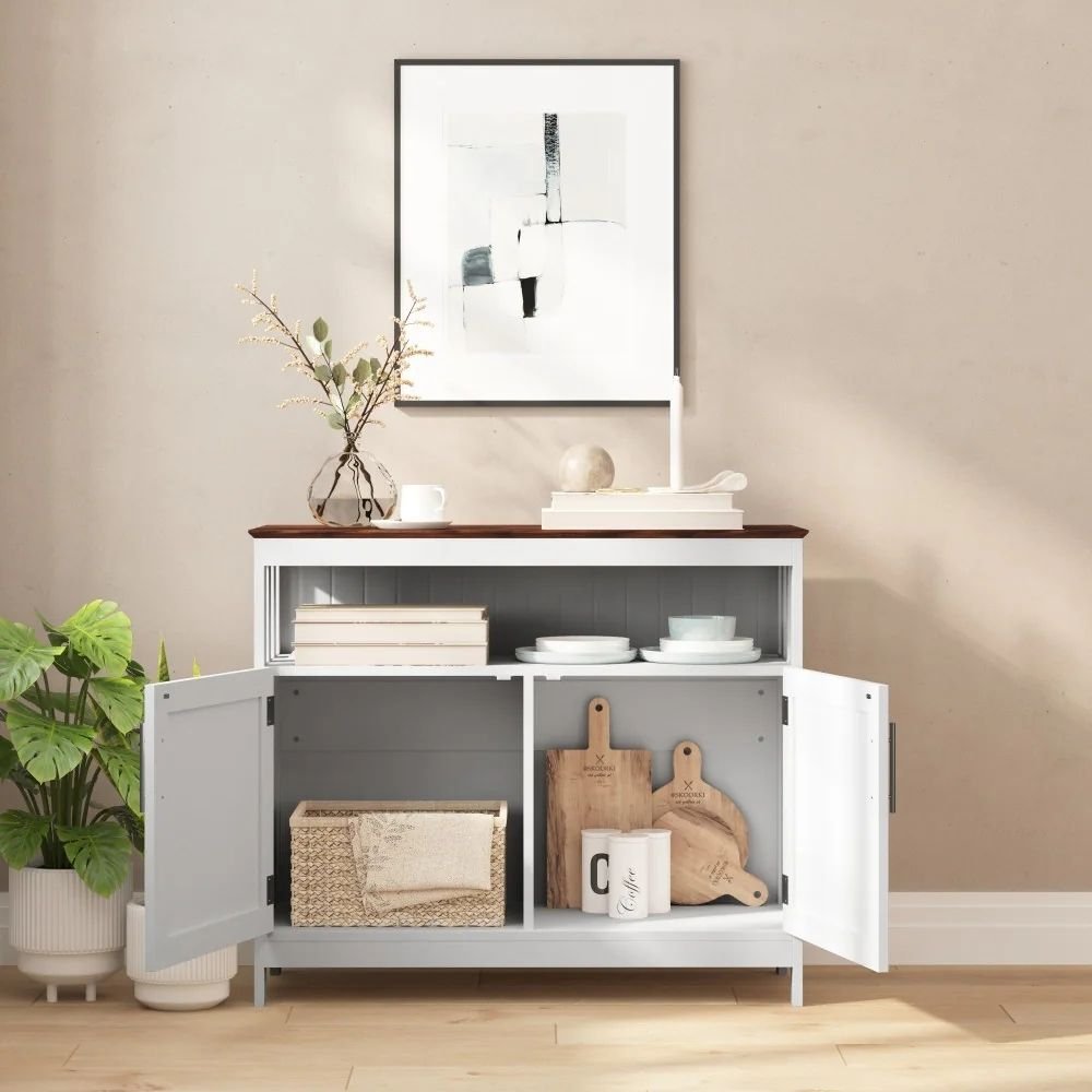 This sideboard buffet stands out with its graceful combination of natural walnut and pure white tones. The rich walnut top showcases authentic wood grain textures, adding warmth and character, while the clean white base enhances brightness and freshness. Together, they form an elegant palette that seamlessly integrates into modern, coastal, or farmhouse-inspired spaces.