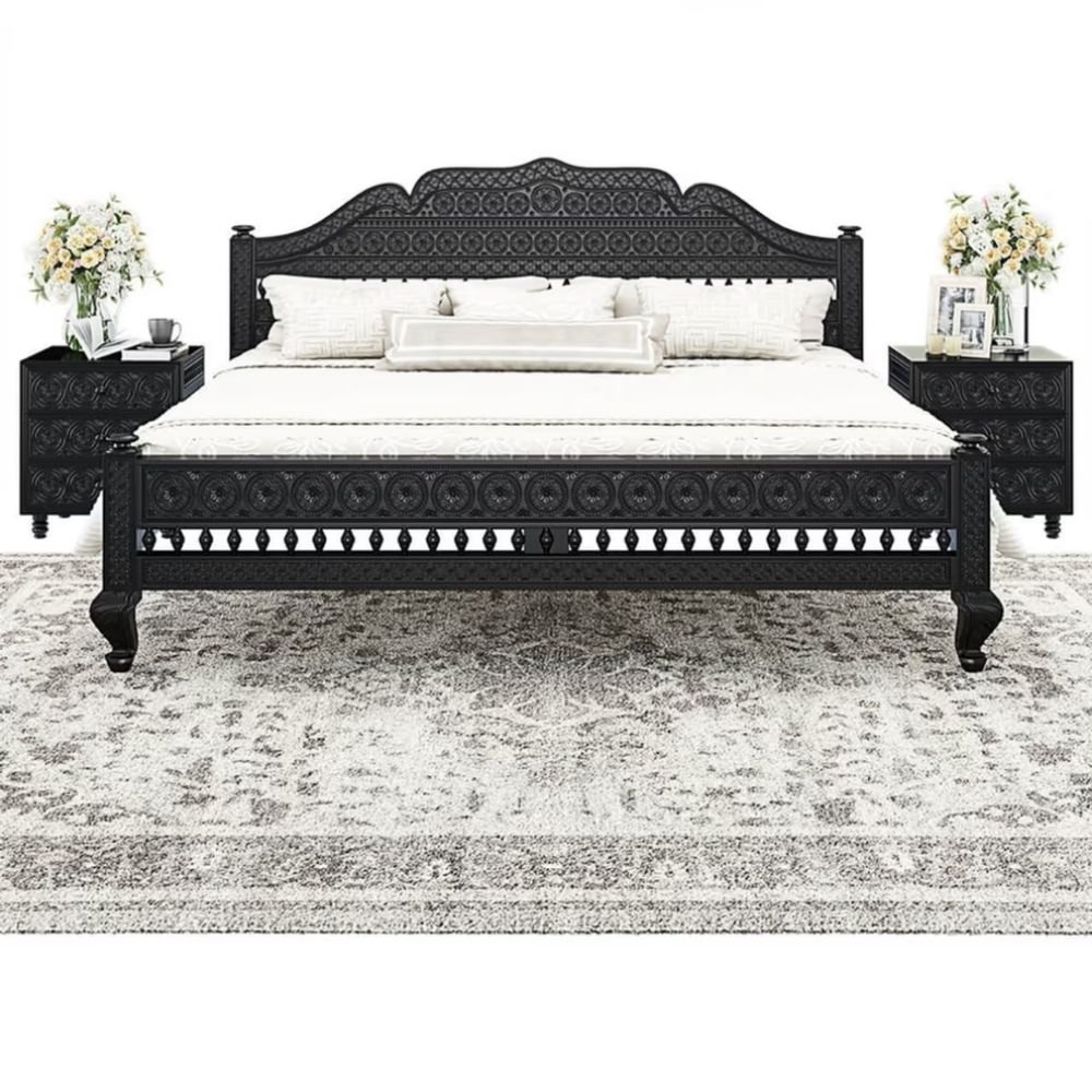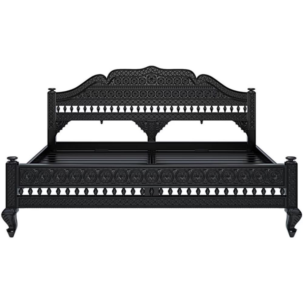 A majestic black solid rosewood bed featuring an intricately hand-carved mandala headboard and royal architectural details - Modera Furnish.