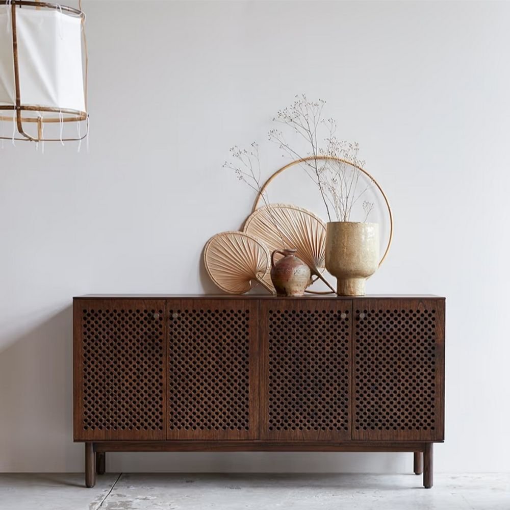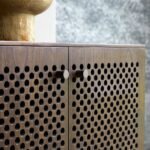 The finish depth is achieved through a multi-step staining process that highlights the 3D texture of the unique perforated door fronts. This geometric pattern creates a tactile experience where the material expression feels warm and organic to the touch despite its sturdy build. Light dances across the surface of the sideboard, revealing subtle variations in the wood grain that ensure no two pieces are exactly alike. It is this dedication to natural detail that elevates the product from simple furniture to a work of functional art. The signature cylindrical legs create a continuous, flowing line that emphasizes the seamless luxury of the solid wood.