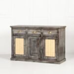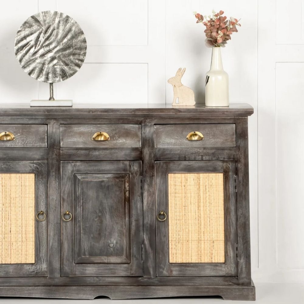 The height of 92 cm is ideal for creating a layered vignette with tall table lamps and framed artwork. By introducing the slate grey tones of this sideboard, you add a layer of sophistication that feels both grounded and airy. Whether styled with minimalist ceramics or lush greenery, the impact of the wood texture creates an inviting atmosphere that reflects a high standard of living and a keen eye for contemporary design. The textured cane and three-door configuration allow for dynamic light play and versatile utility, making the piece a asset as your personal style evolves.