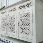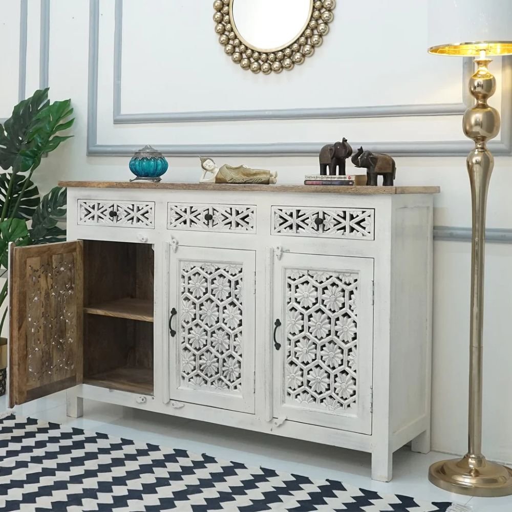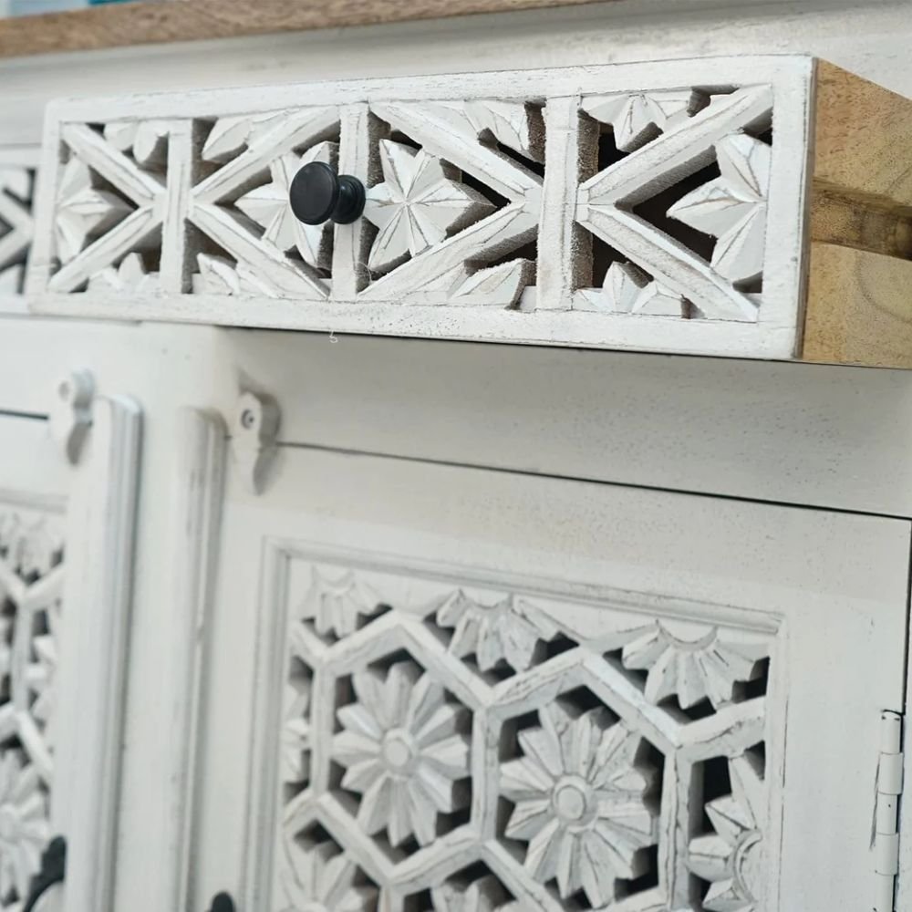 Home Bedroom Cabinets Geometric Wood Sideboard with Floral Carving – Brave Heritage