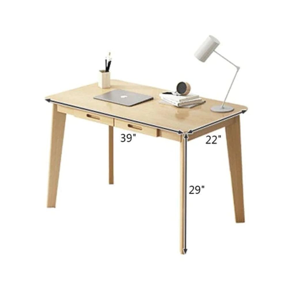 A natural finish solid teak wood study table featuring two flush-mount storage drawers, tapered legs, and a minimalist architectural silhouette - Modera Furnish.
