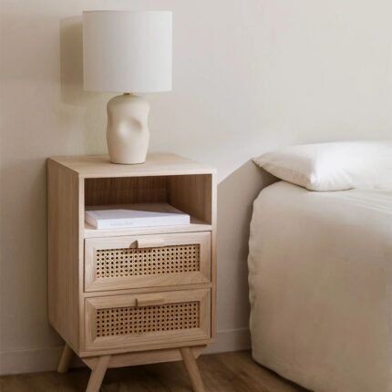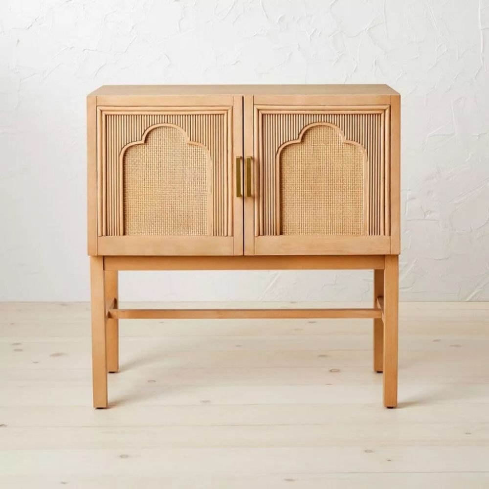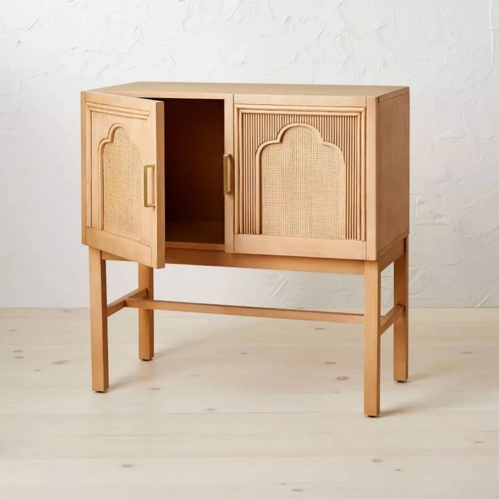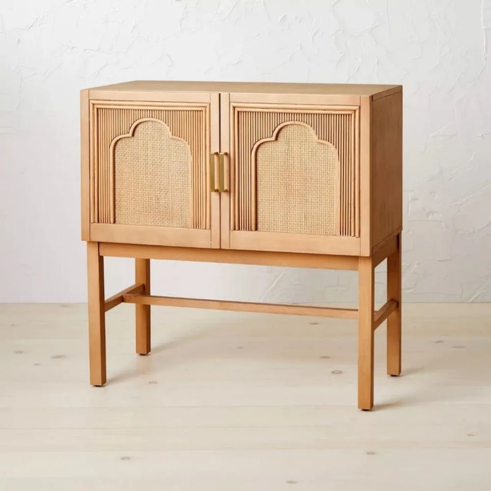 Arched Rattan Panels: Features hand-woven natural cane inserts with a unique architectural silhouette for organic texture.