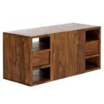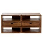Every joint and angle is reinforced to provide a seamless look that highlights the natural durability of the timber. The substantial weight of the solid wood base ensures that the TV unit stays securely in place, even when supporting large-screen displays and heavy media hardware. By prioritizing a “storage-first” approach, the design focuses on clean lines and a functional footprint, making this TV unit an essential element for organized and sophisticated modern living spaces. The internal framing is built to handle significant weight, allowing for a diverse range of electronic configurations while maintaining its perfectly level and sleek architectural profile.