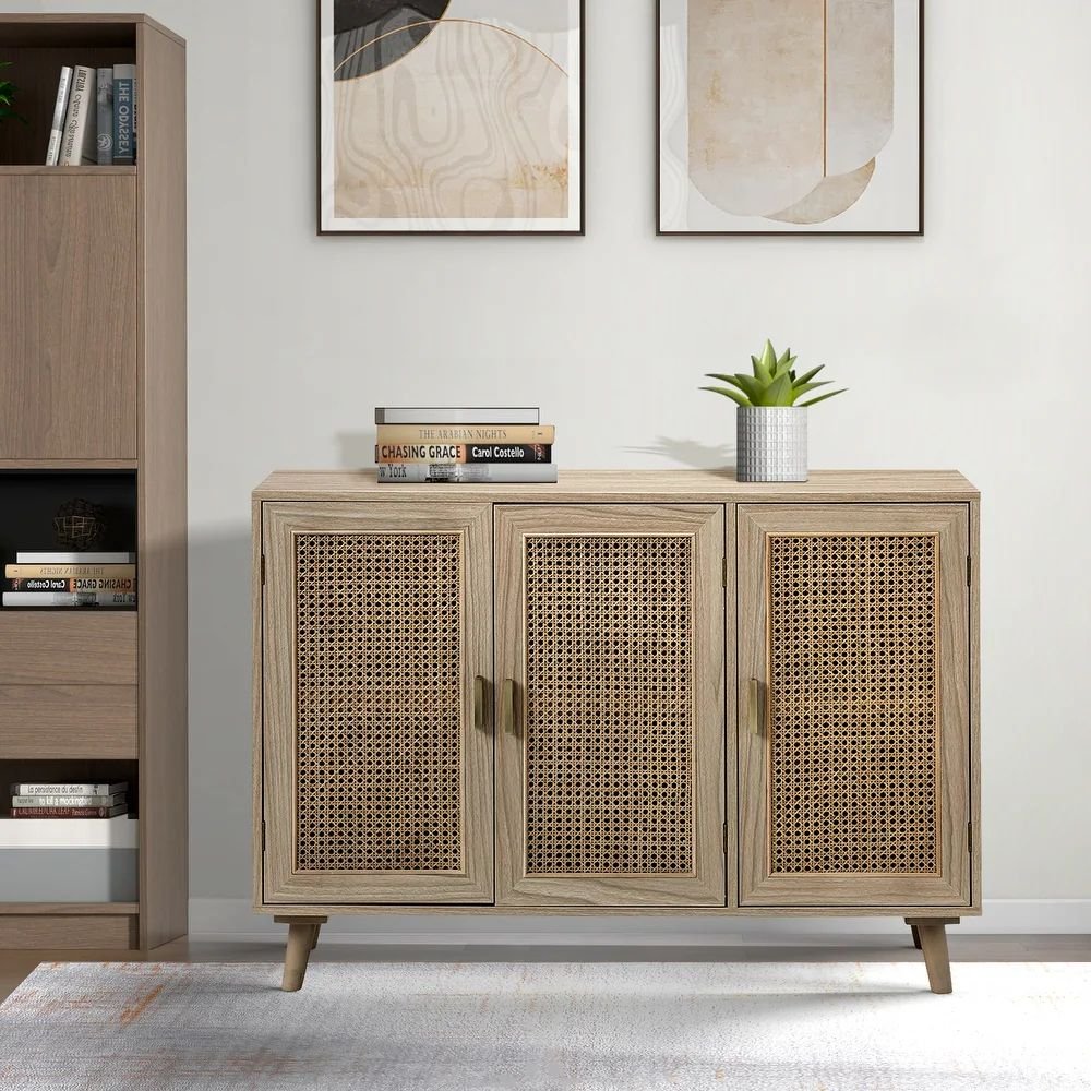 The height of 30.1 inches is ideal for creating a layered vignette with tall table lamps and framed artwork. By introducing the warm brown tones of this cabinet, you add a layer of sophistication that feels both grounded and airy. Whether styled with minimalist ceramics or lush greenery, the impact of the wood and cane texture creates an inviting atmosphere that reflects a high standard of living. The three-door configuration allows for dynamic decor displays, making this cabinet a versatile asset as your personal style evolves over time.