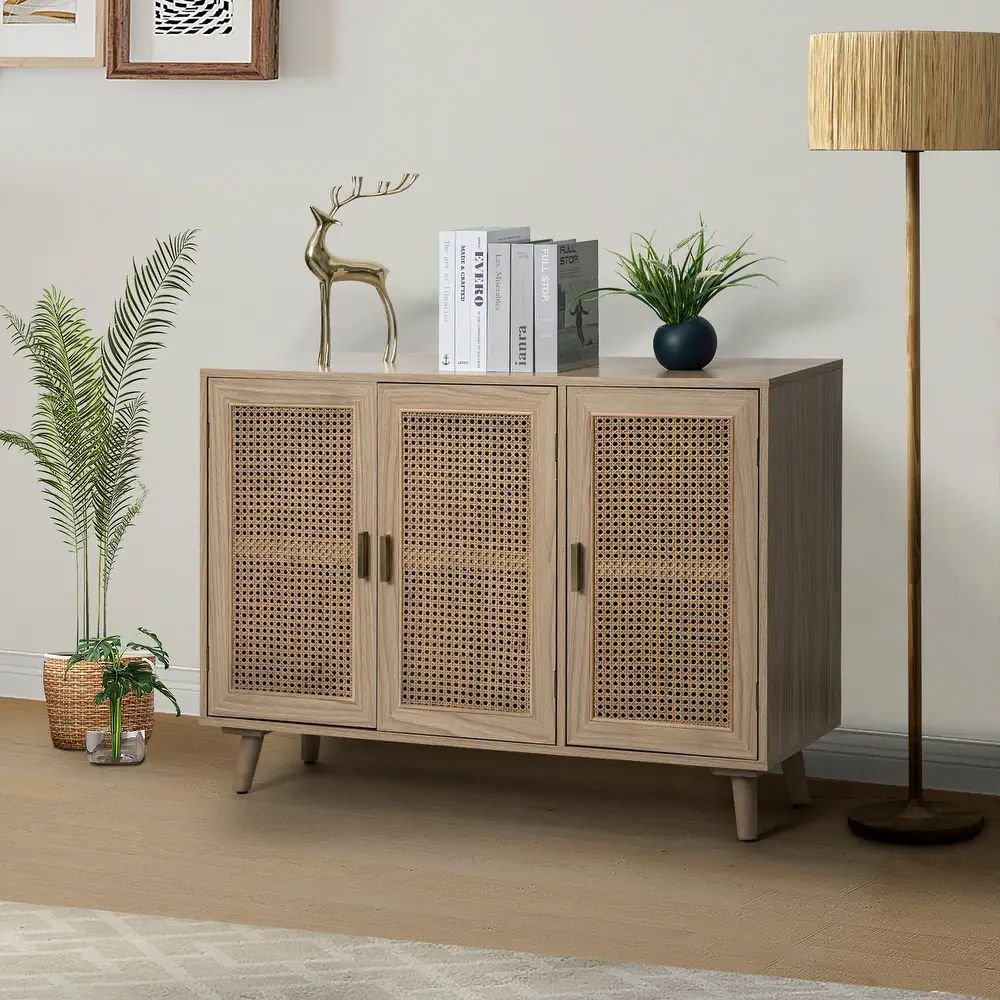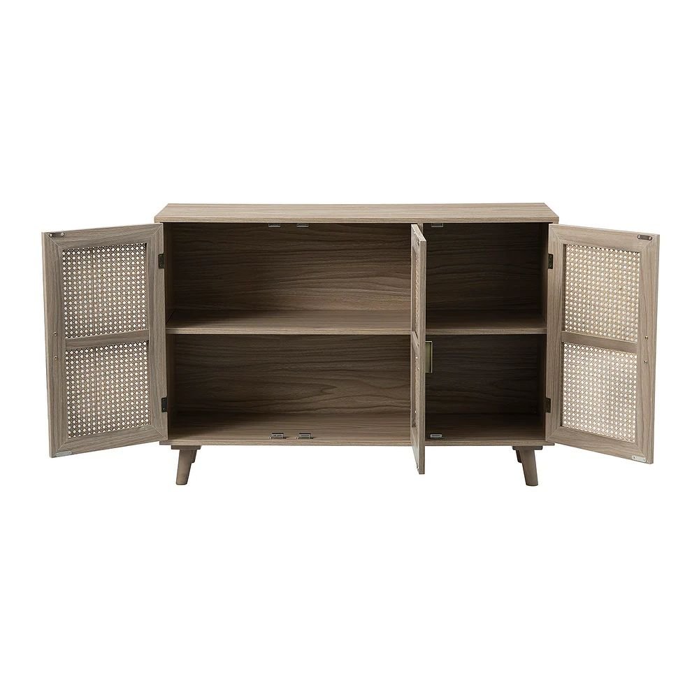 Triple Door Organization: Features three smooth-opening doors with breathable cane inlays that reveal ample shelving for household essentials.