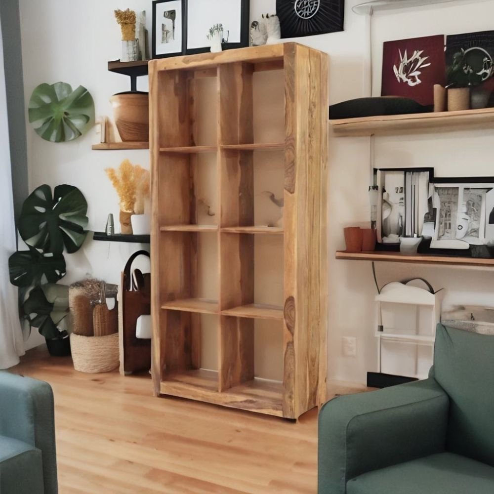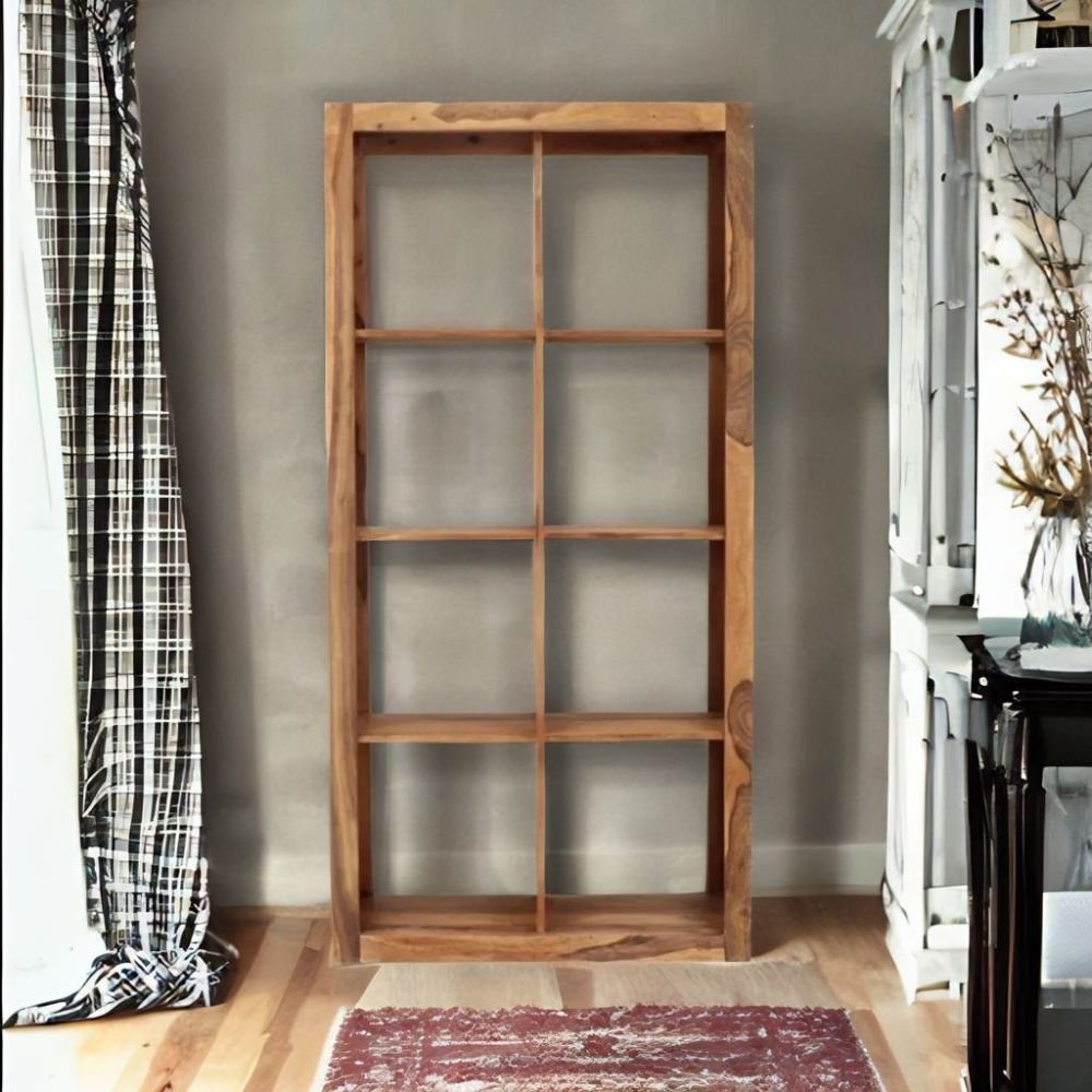 The structural integrity of this piece is rooted in the use of premium solid wood, ensuring a lifetime of reliability. Its vertical frame features eight symmetrical open cubes for maximum organization.