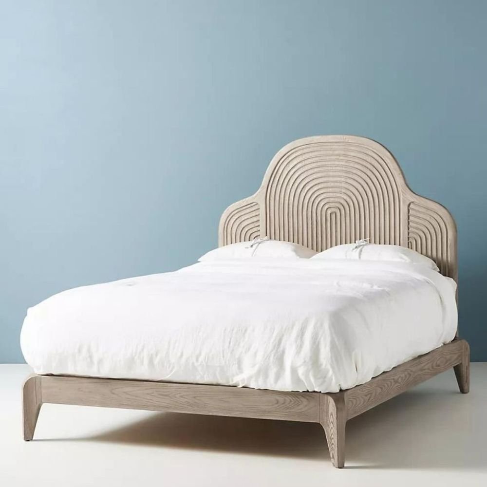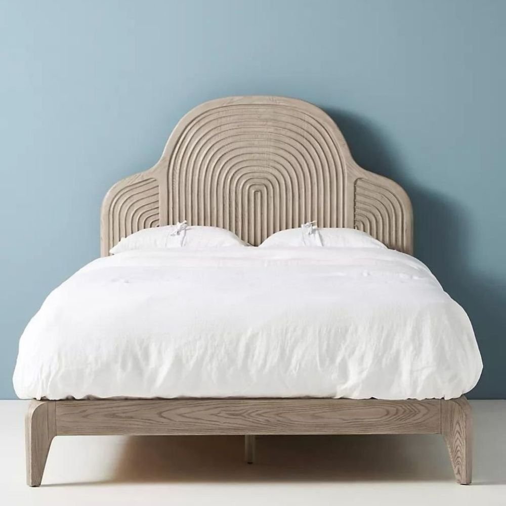 Solid Wood Bed with Arched Carved Headboard – Elara Mist