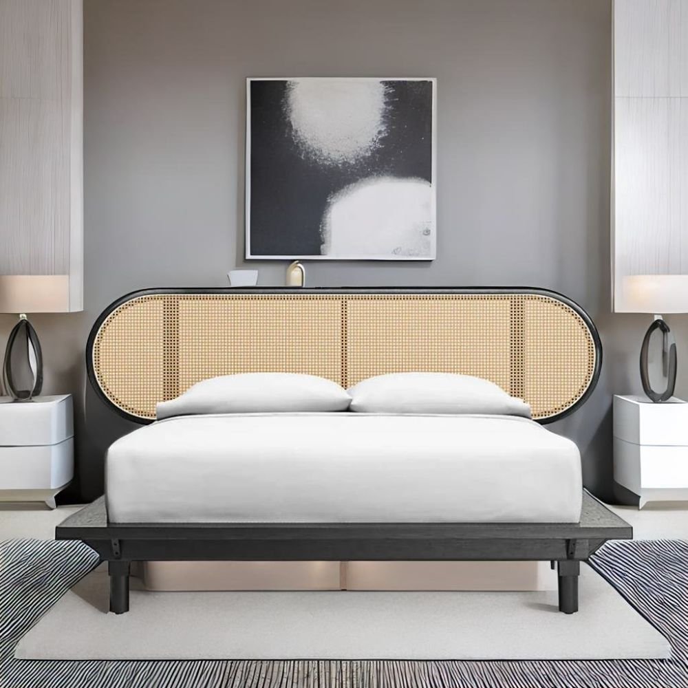 A black finish hardwood double bed featuring a large oval headboard with natural cane inlays - Modera Furnish.